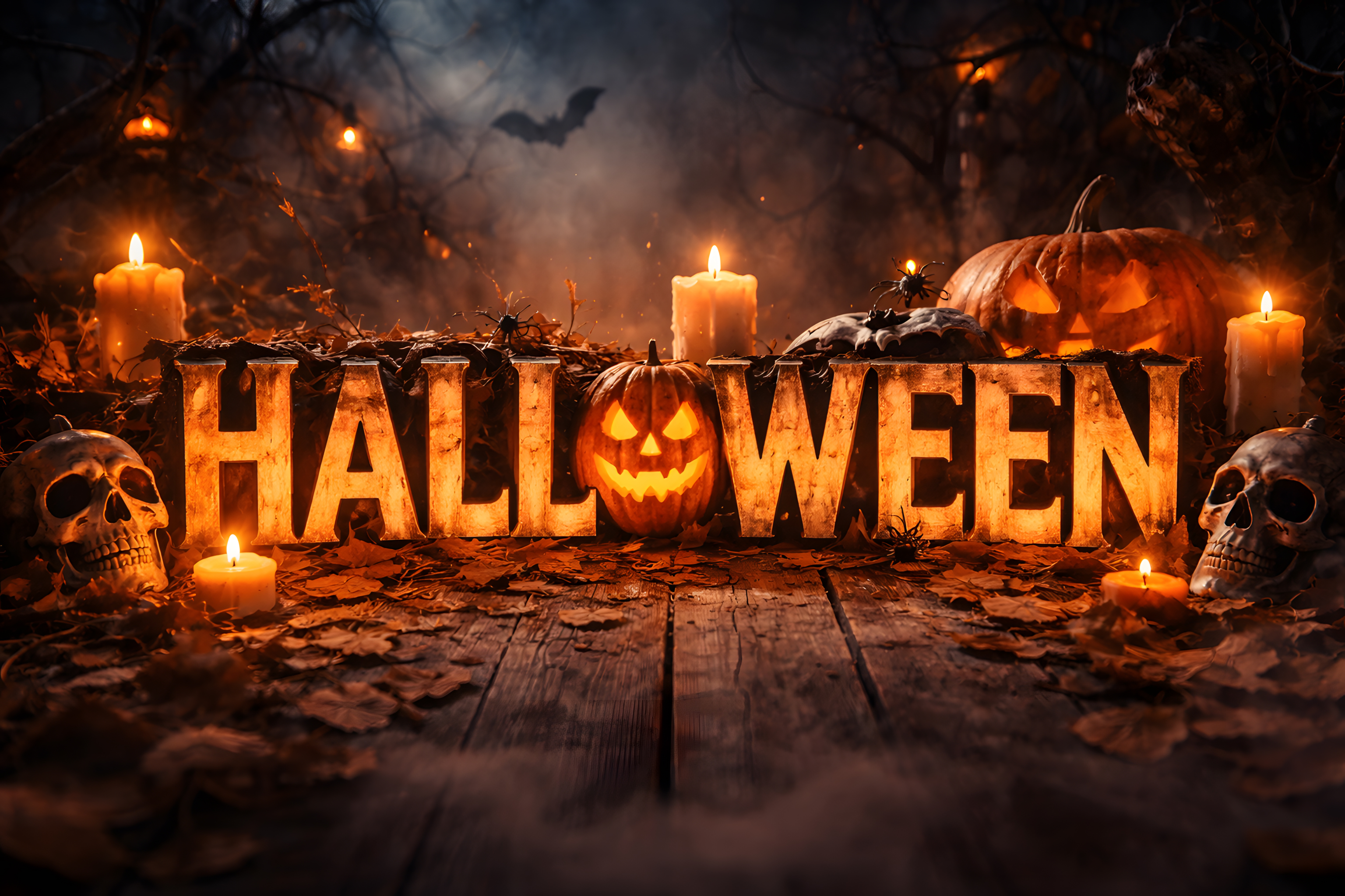 Dieses beeindruckende Halloween-Foto zeigt eine düstere und mystische Szenerie, die perfekt zur gruseligen Jahreszeit passt. Auf einem Holztisch sind verschiedene herbstliche Dekorationselemente wie Kürbisse, Kerzen und Schädel angeordnet, die von einem Nebelschleier umhüllt sind. Im Hintergrund sind weitere Kerzen und ein knorriger Baum zu sehen, der eine bedrohliche Atmosphäre schafft. Das Bild besticht durch seine stimmungsvolle Beleuchtung und die perfekte Komposition. Es eignet sich hervorragend als Vorlage für Halloween-Dekorationen, Fotoshootings, Social-Media-Posts oder als Eye-Catcher in Blogs, Präsentationen oder Newslettern rund um das Thema Herbst und Gruselkino. Die düstere Ästhetik und die sorgfältig arrangierten Details machen dieses Foto zu einem echten Hingucker.