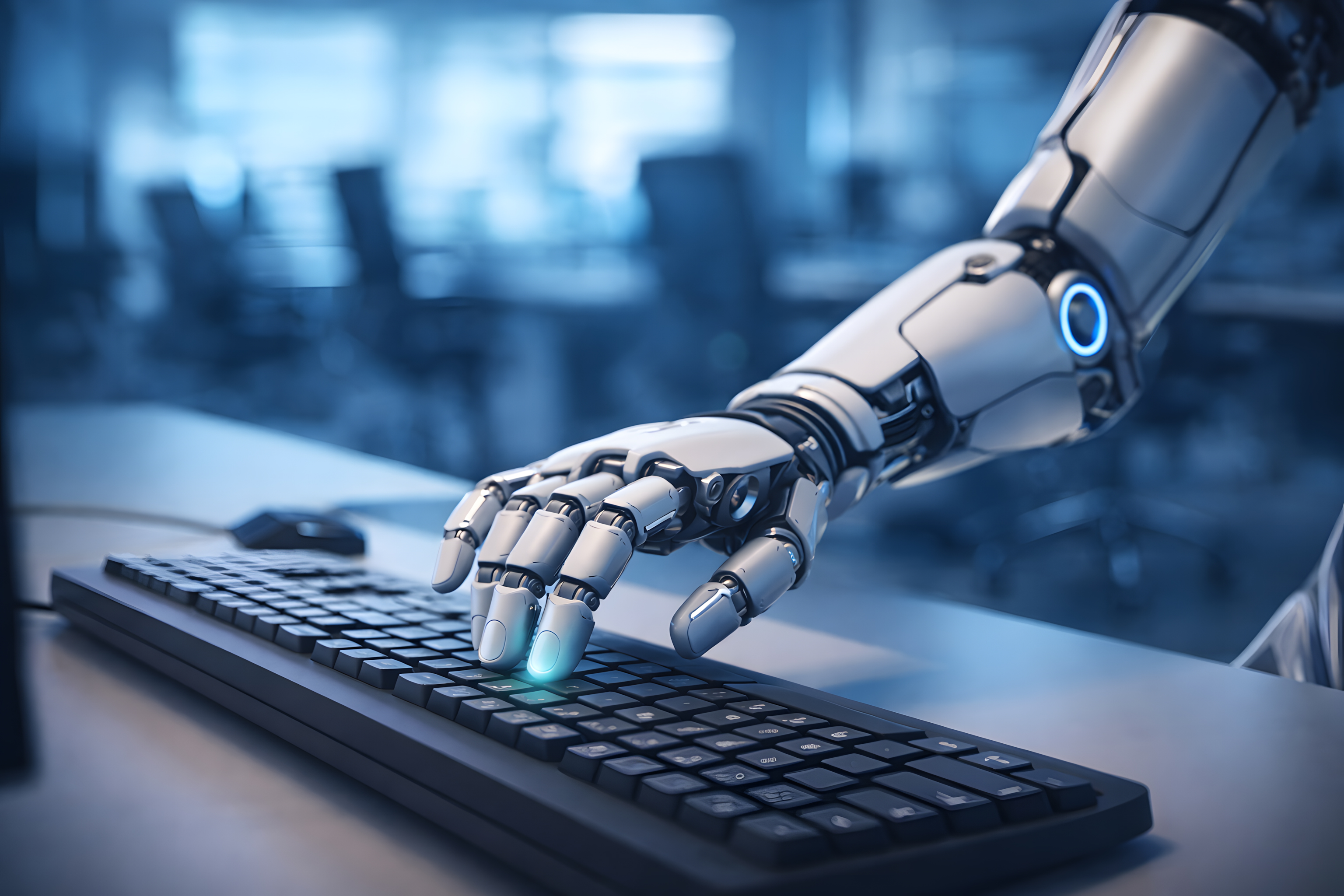 Das Bild zeigt eine detaillierte Nahaufnahme einer futuristischen Roboterhand, die auf einer modernen Computertastatur platziert ist. Die glänzende, metallische Oberfläche der Handprothese, bestückt mit Sensorknöpfen und Gelenken, vermittelt einen Eindruck von Präzision und Fortschritt in der Robotik und künstlichen Intelligenz. Der kühle, bläuliche Farbton des Hintergrunds verstärkt den technologischen, fast sci-fi-artigen Charakter der Szene.