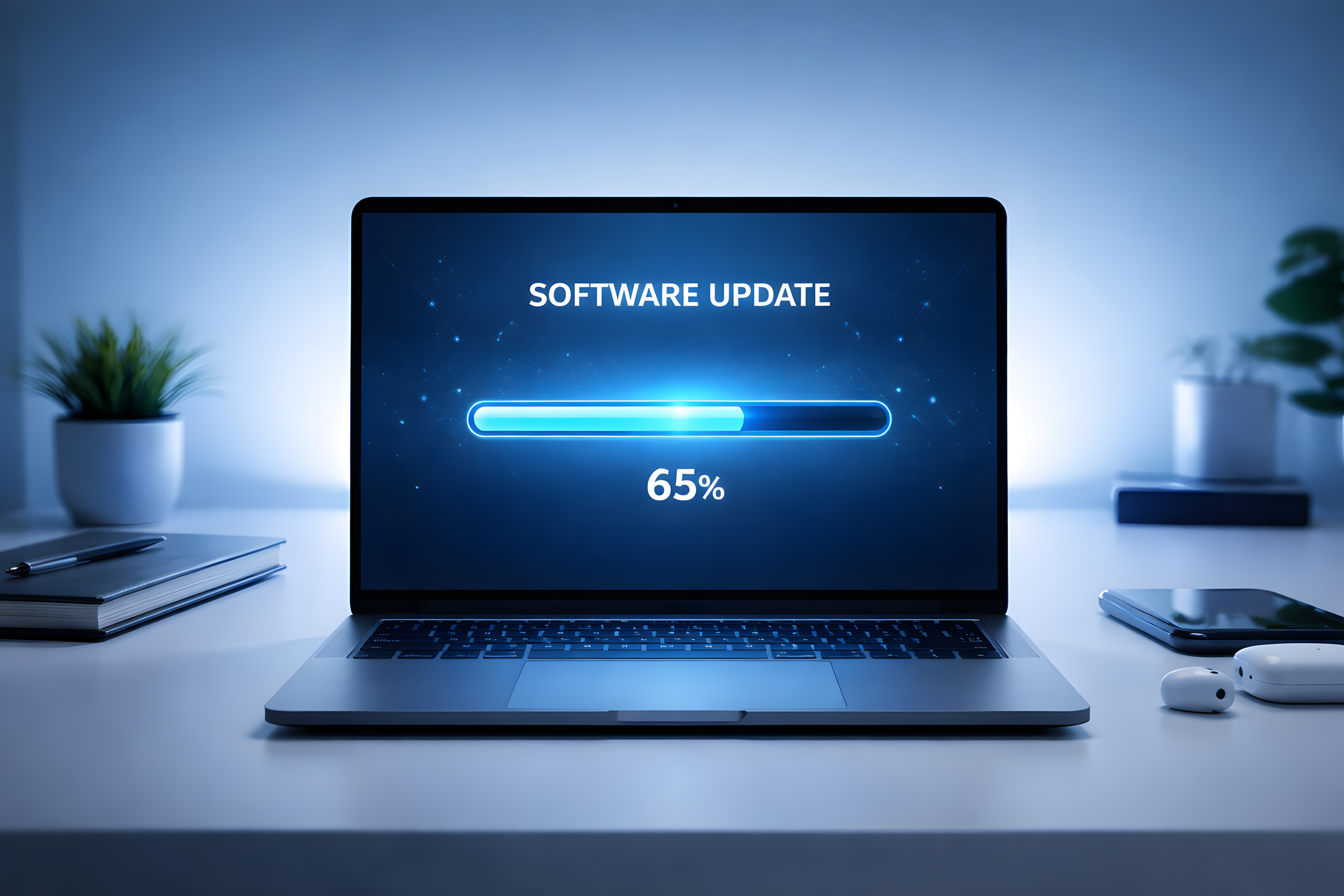 Das Bild zeigt einen Laptop-Bildschirm, auf dem ein Software-Update-Fenster mit einem Fortschrittsbalken zu sehen ist. Der Fortschrittsbalken ist blau und zeigt an, dass das Update zu 65% abgeschlossen ist. Der Laptop steht auf einem Tisch mit weiteren Büro-Utensilien wie einem Stift, einem Pflanzentopf und einem Mobiltelefil. Der dunkelblaue Hintergrund verleiht dem Bild eine professionelle und technische Atmosphäre.