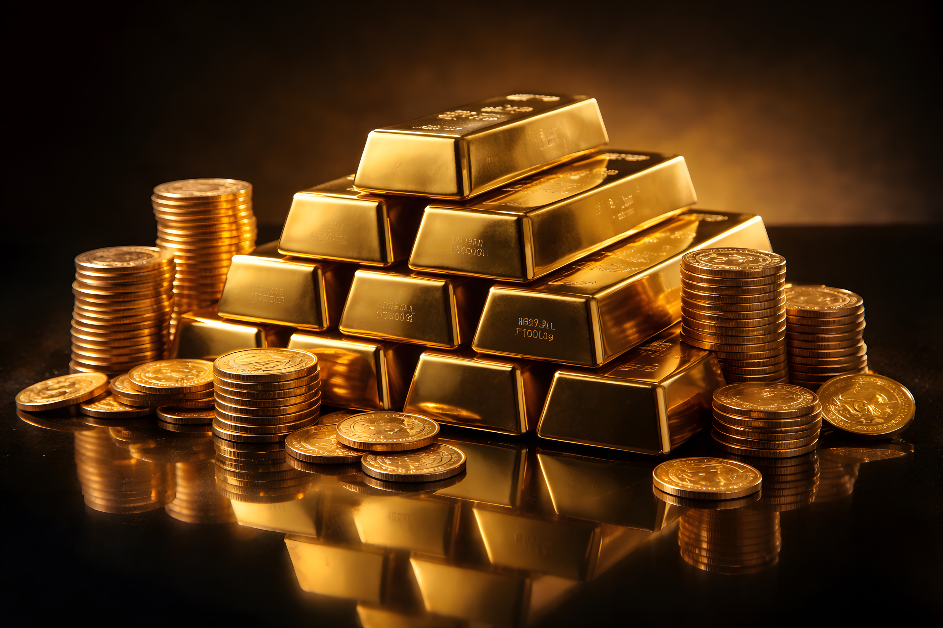 Das Bild zeigt einen beeindruckenden Haufen glänzender Goldbarren und Goldmünzen auf einem dunklen Hintergrund. Die massiven Goldklumpen und Münzen stellen den Reichtum und die Wertschätzung des wertvollen Edelmetalls dar. Das intensive, warme Gold strahlt eine Aura von Wohlstand, Sicherheit und Erfolg aus. Die perfekte Anordnung der Goldblöcke und Münzen verleiht dem Arrangement einen ästhetischen, fast künstlerischen Charakter.