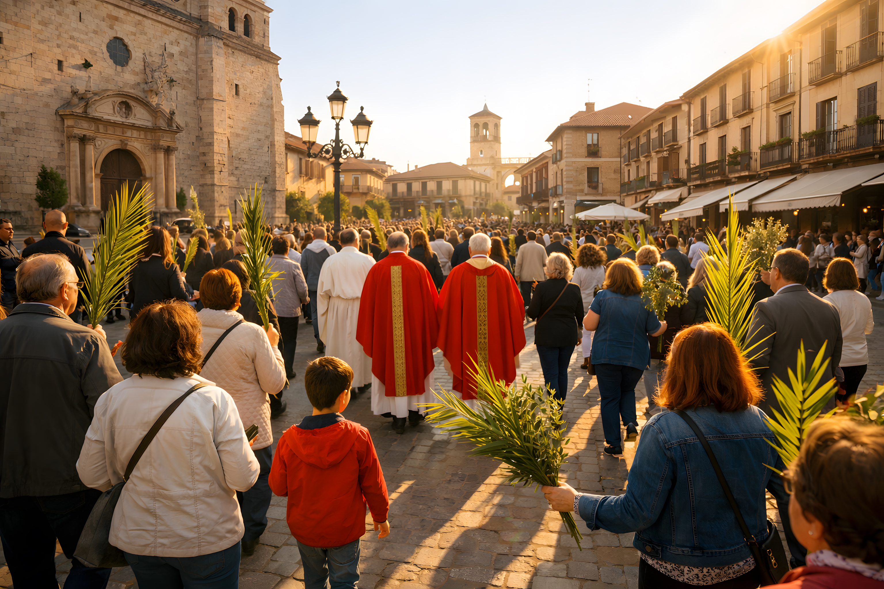 Das Foto zeigt eine bunte und feierliche Szene in einer spanischen Altstadt. Zu sehen ist eine Prozession mit Gläubigen in traditionellen roten Roben, die von der Kirche durch die Gassen der Stadt laufen. Die Sonne scheint durch die Bäume und wirft warme Lichter auf die Menge. Im Hintergrund sind weitere Gebäude in mediterranem Baustil zu erkennen. Die Stimmung ist feierlich und feiertagsmäßig. Das Foto lässt sich gut in Blogs, für Präsentationen zu Reisethemen oder in sozialen Medien einsetzen, um eine Atmosphäre von Tradition, Frömmigkeit und Gemeinschaft zu vermitteln.
