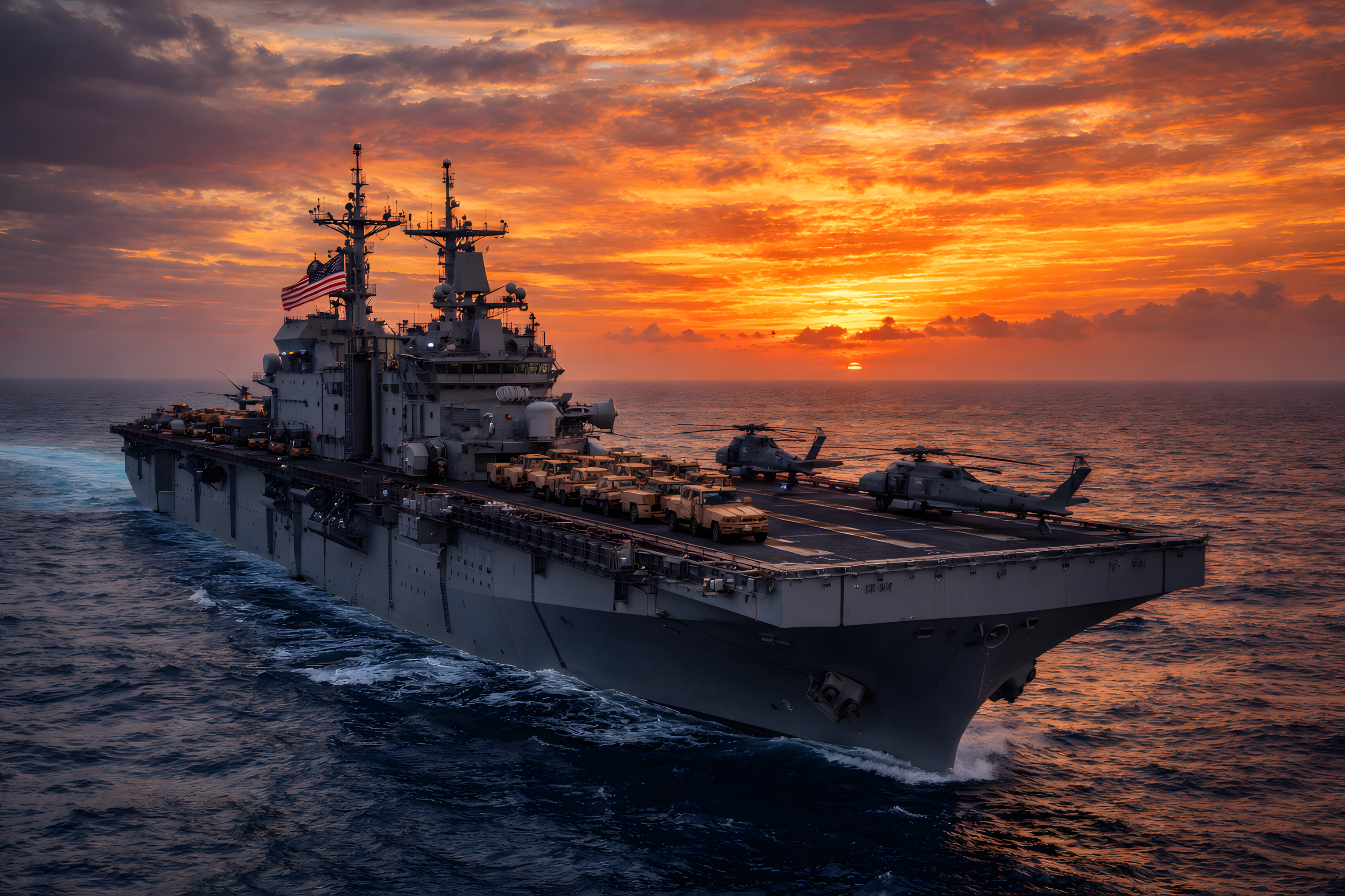 Dieses beeindruckende Foto zeigt einen mächtigen Flugzeugträger, der majestätisch über die Wellen gleitet, während ein atemberaubender Sonnenuntergang den Abendhimmel in ein dramatisches Farbspiel taucht. Die Silhouette des Schiffes hebt sich vor dem orangeroten Himmel ab, dessen Reflexionen sich auf der Wasseroberfläche spiegeln. Das Bild vermittelt einen Eindruck von Kraft, Technologie und militärischer Präsenz. Es wäre ideal für den Einsatz in Berichten über Sicherheitspolitik, Militär oder Reisethemen, aber auch für Präsentationen, Blogbeiträge oder Werbekampagnen zu den Themen Technik, Fortschritt oder Abenteuer. Die dramatische Stimmung und die beeindruckende Komposition machen dieses Foto zu einem Blickfang, das die Aufmerksamkeit des Betrachters sicher fesseln wird.