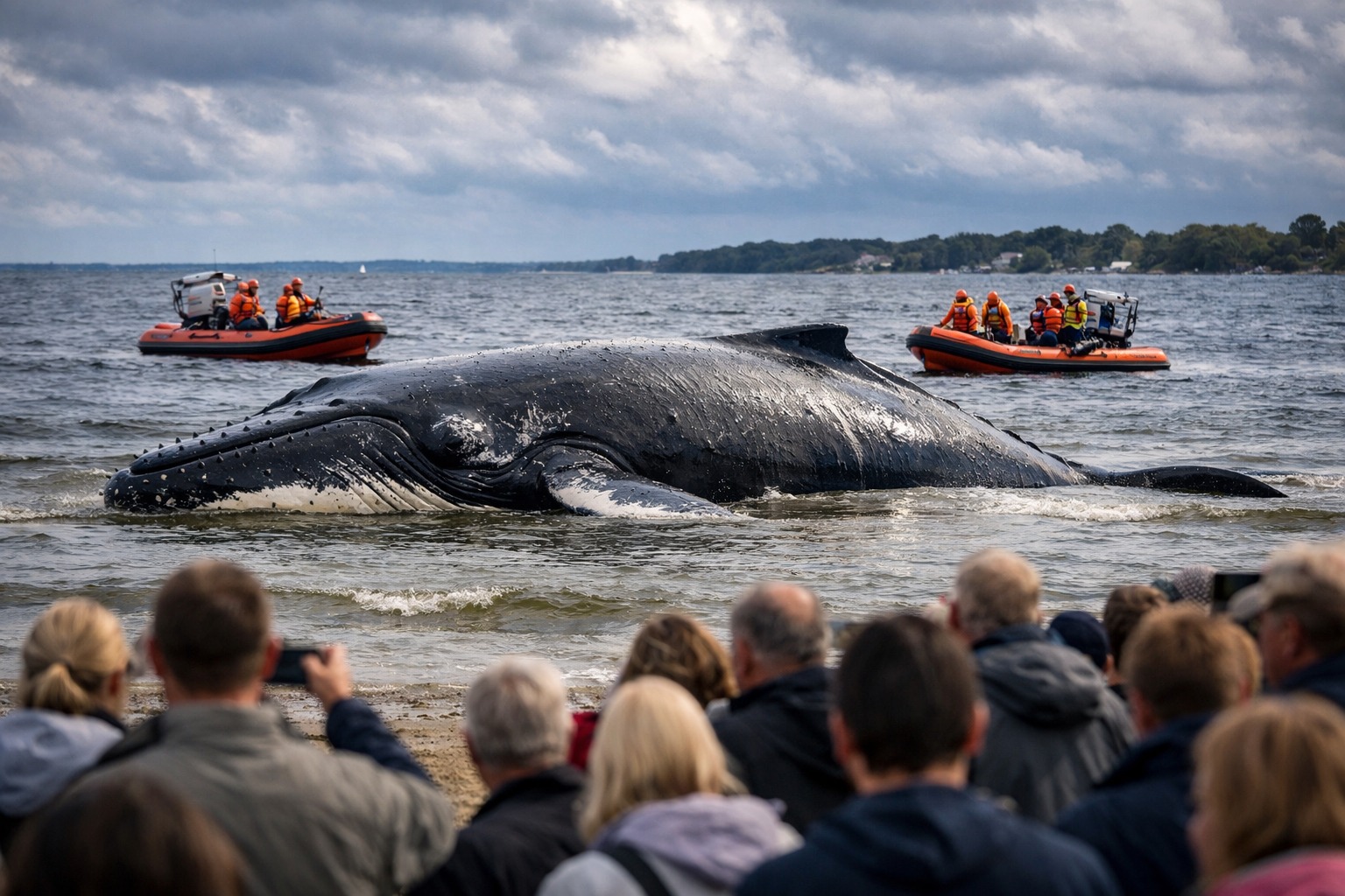Das Foto zeigt eine beeindruckende Szene am Strand. Im Vordergrund ist ein großer Wal zu sehen, der offenbar aus dem Wasser gerettet wurde. Rettungskräfte in orangefarbenen Schutzanzügen sind um das Tier herum postiert, um es zu versorgen und zu überwachen. Im Hintergrund sieht man eine Menge von Schaulustigen, die sich um das Geschehen versammelt haben.
