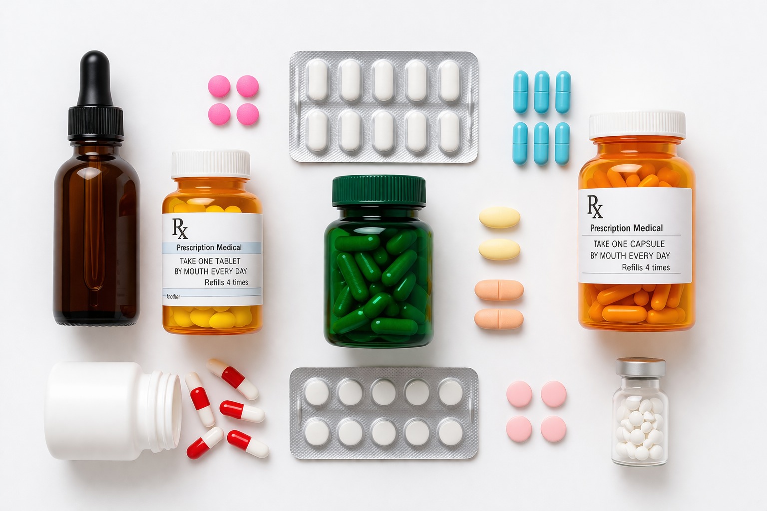 Dieses Foto zeigt eine Vielzahl von verschiedenen Medikamenten und Pillen auf weißem Hintergrund. Es sind Flaschen, Blister und Kapseln in unterschiedlichen Farben und Formen zu sehen. Die Anordnung der Produkte lässt auf eine professionelle Studiofotografie schließen, die für medizinische oder pharmazeutische Zwecke verwendet werden könnte. Das Bild vermittelt einen Überblick über verschiedene Heilmittel und Präparate und eignet sich daher gut für den Einsatz in Blogs, Social-Media-Kanälen, Newslettern oder Präsentationen im Gesundheits- und Medizinbereich. Mit den vielen sichtbaren Details und Texturen bietet es zudem interessante Möglichkeiten für das visuelle Marketing von Pharmaprodukten.