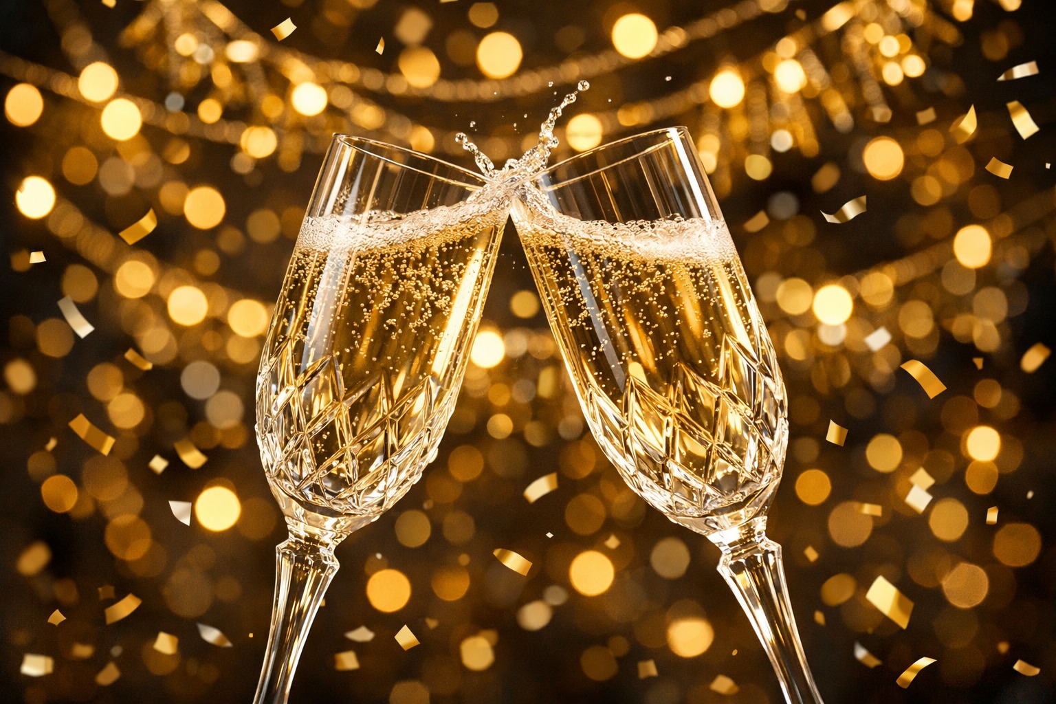 Das Foto zeigt zwei kristallklare Champagnergläser, die auf eine festliche Feier anstoßen. Die Gläser sind mit funkelnd-goldenem Champagner gefüllt und werfen ein warmes, stimmungsvolles Licht ab. Im Hintergrund ist ein verschwommener Bokeh-Effekt zu sehen, der eine fröhliche, prickelnde Atmosphäre erzeugt.
