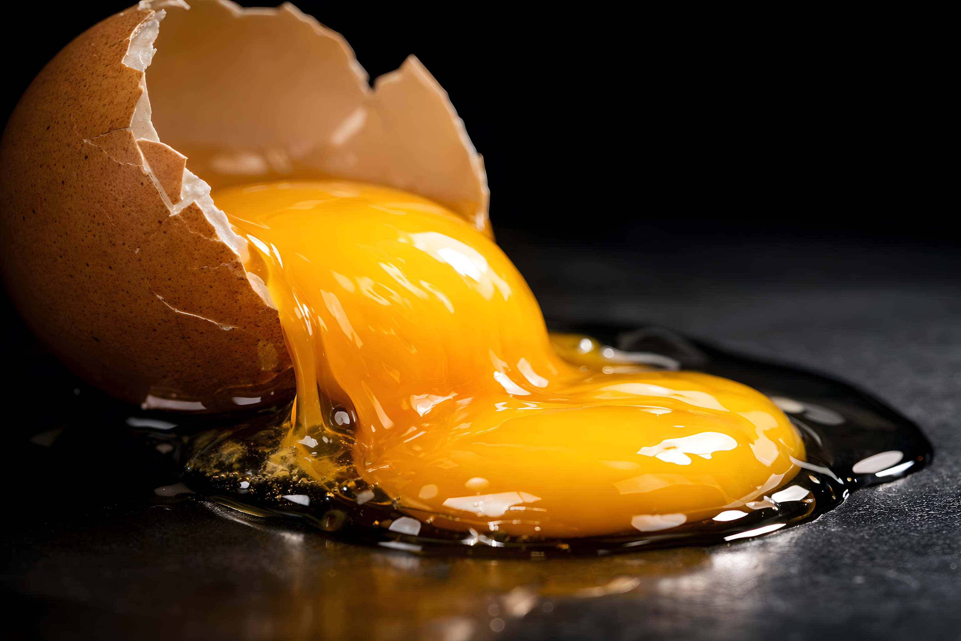 Dieses Foto zeigt den Moment, in dem ein Ei zerbrochen ist und der goldgelbe, flüssige Dotter auf einer dunklen, glatten Oberfläche verteilt wird. Der Kontrast zwischen dem leuchtenden Gelb und dem tiefen Schwarz erzeugt eine minimalistisch-elegante Ästhetik. Die Nahaufnahme lässt die natürliche Struktur und Textur des Dotters deutlich erkennen.