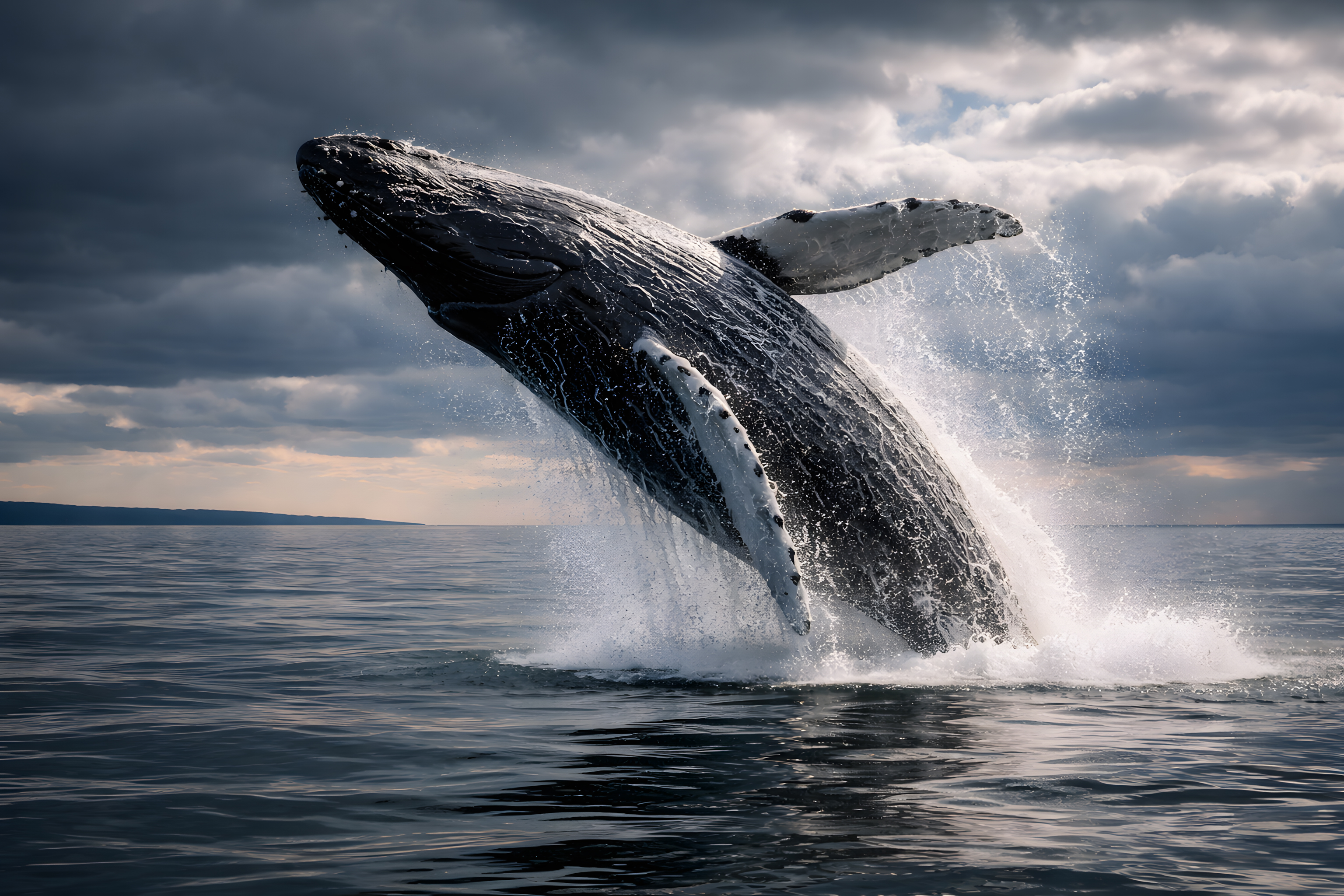 Das beeindruckende Foto zeigt einen majestätischen Buckelwal, der sich mächtig aus den Wellen erhebt. Der riesige Meeressäuger scheint förmlich aus dem aufgewühlten, dunklen Wasser emporzuspringen, umgeben von schäumenden Wassermassen. Im Hintergrund erstreckt sich ein dramatisch bewölkter Himmel, der der Szene eine mystische Atmosphäre verleiht.
