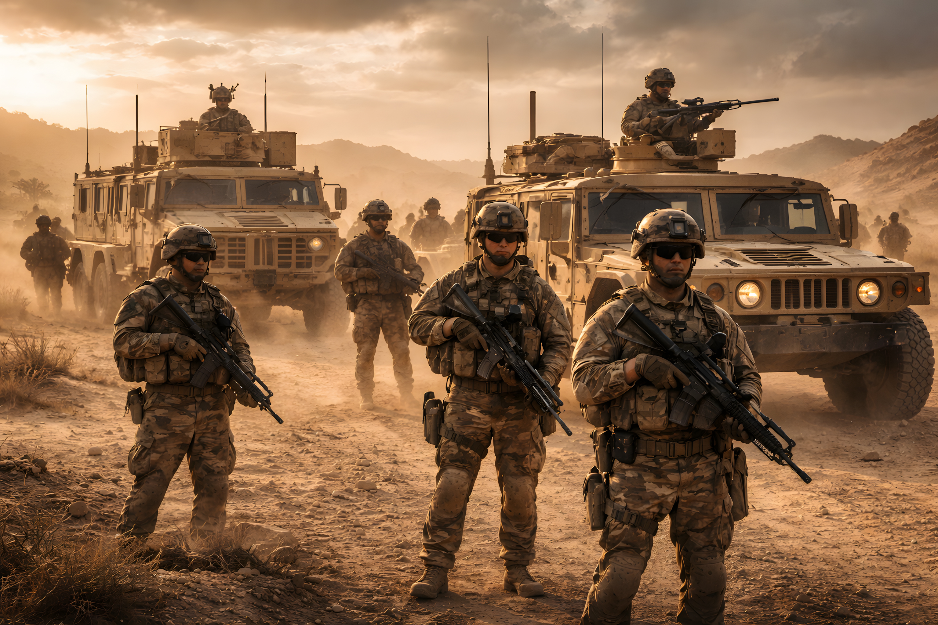 Das Foto zeigt eine Einsatztruppe von Soldaten in der Wüste. Im Vordergrund sind mehrere Soldaten in Tarnung-Uniform zu sehen, die schwere Ausrüstung und Waffen tragen. Im Hintergrund sind gepanzerte Fahrzeuge und weitere Soldaten zu erkennen, die offensichtlich in eine Mission oder einen Einsatz verwickelt sind.