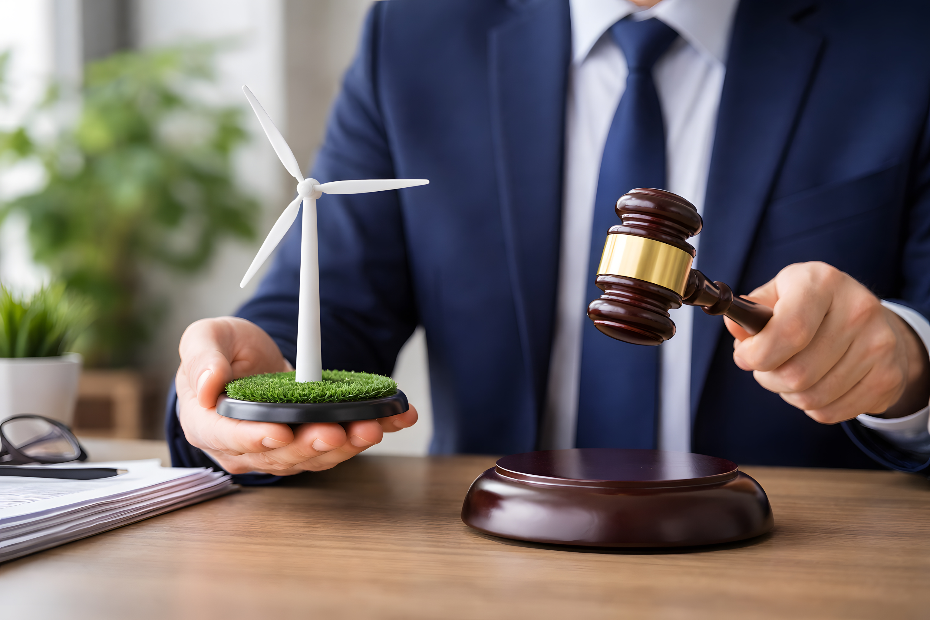 Das Bild zeigt einen Richter oder Anwalt, der in seinem Büro oder Gerichtssaal einen Holzrichterklöppel auf einen Modellwindrad-Sockel mit Gras herabsenkt. Dies symbolisiert, wie rechtliche Fragen und Urteile im Bereich der Windkraft und des Umweltschutzes getroffen werden. Der Mann im Anzug und mit Krawatte repräsentiert die formelle, juristische Entscheidungsgewalt, während das Windrad und der Grünanteil für die Themen Erneuerbare Energie und Nachhaltigkeit stehen. Das Bild könnte für Beiträge zu rechtlichen Aspekten der Energiewende, der Genehmigung von Windkraftanlagen oder Gerichtsurteilen zu Umweltthemen verwendet werden. Es eignet sich für Blogs, Social-Media-Posts, Präsentationen oder Newsletter rund um Energiepolitik, Klimaschutz und die Rolle des Rechts in diesen Bereichen.