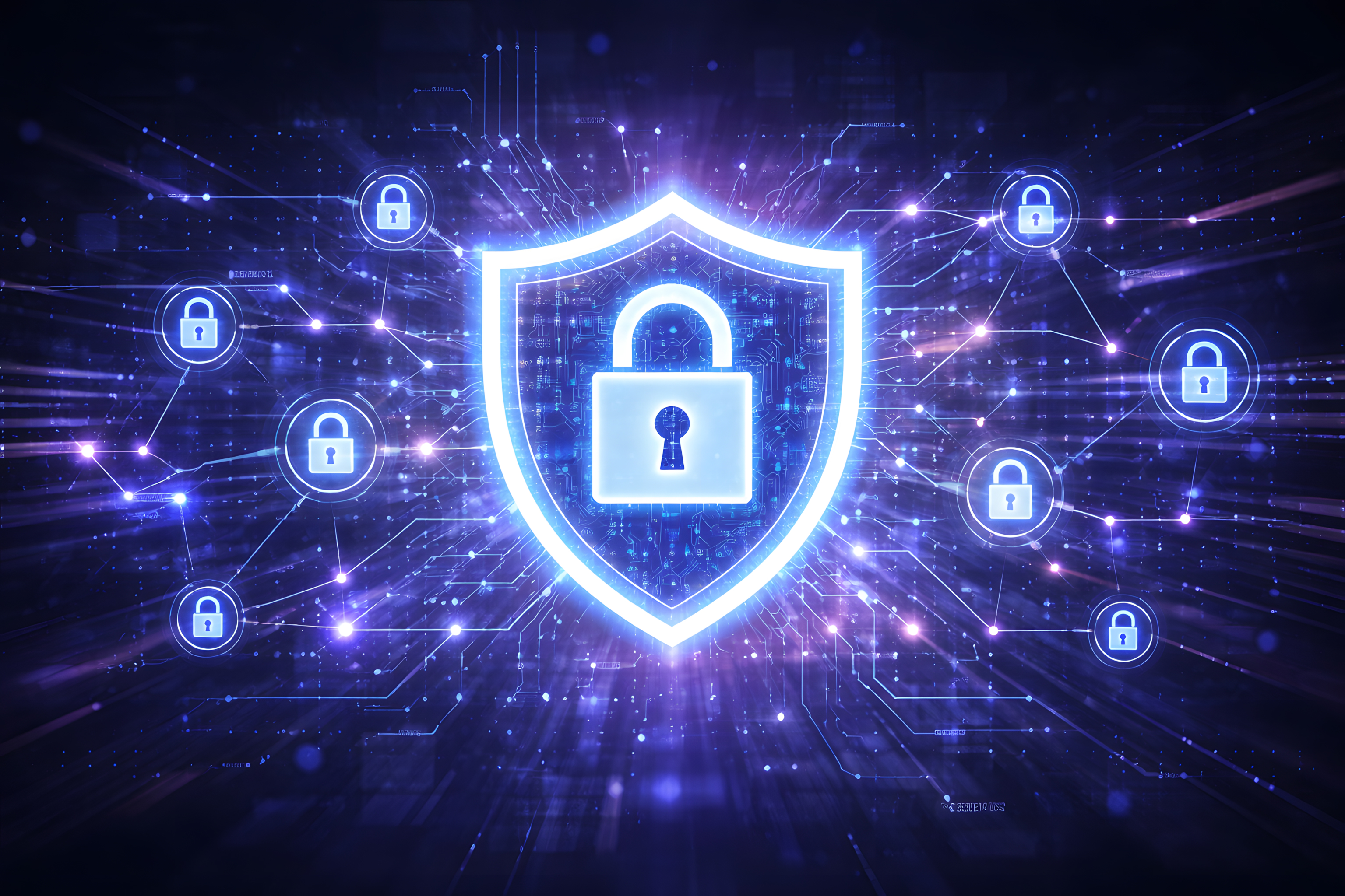 Dieses Konzeptbild veranschaulicht die digitale Sicherheit und den Schutz vor Cyber-Bedrohungen. Im Zentrum steht ein leuchtendes Schloss-Symbol, umgeben von Datenschlössern, Netzwerksymbolen und anderen digitalen Elementen. Der dunkle Hintergrund mit blauem Licht und Funken verleiht dem Bild eine futuristische, technologische Atmosphäre.