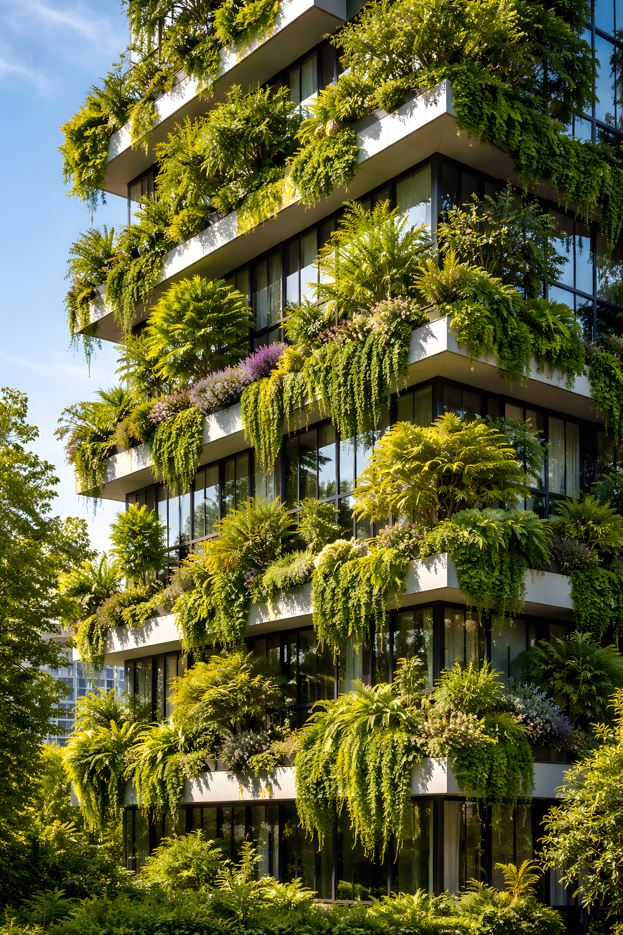 Dieses faszinierende Foto zeigt ein städtisches Hochhaus, das vollständig in eine grüne Oase verwandelt wurde. Die Fassade ist mit üppigen Pflanzen und Klettgewächsen überzogen, die sich in verschiedenen Nuancen von Grün und Gelb über die Etagen erstrecken. Die sichtbaren Balkone sind ebenfalls bepflanzt, was dem Gebäude eine natürliche, fast tropische Ausstrahlung verleiht.
