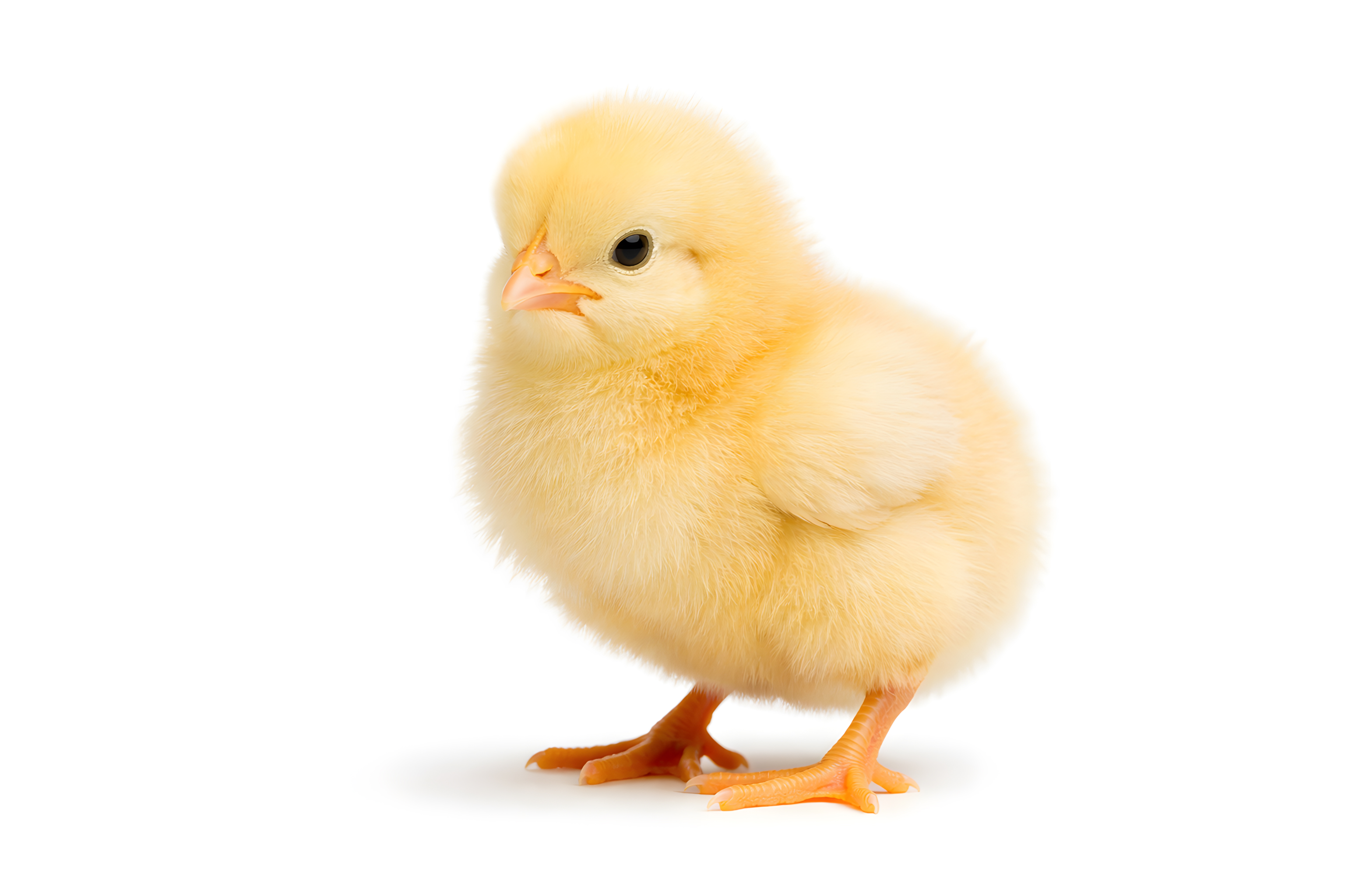 Das Bild zeigt ein süßes, gelbes Küken mit fluffigem Federkleid und neugierigem Blick. Das kleine Jungtier steht auf einem weißen Untergrund und blickt direkt in die Kamera. Die natürliche Beleuchtung und die saubere, minimalistische Aufnahme verleihen dem Motiv einen liebevollen, zarten Charakter.