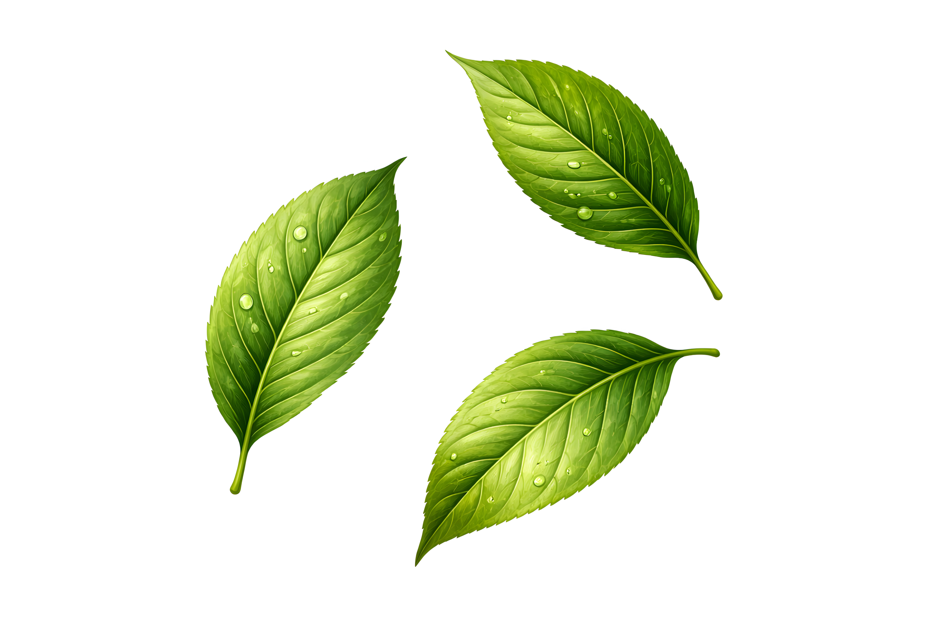 Dieses Foto zeigt drei grüne, glänzende Blätter mit kleinen Wassertropfen darauf. Die Blätter sind sorgfältig vor weißem Hintergrund angeordnet und heben sich so besonders hervor. Die intensive, lebendige Grünfärbung und die klaren, rundlichen Tropfen verleihen dem Bild einen natürlichen, frischen und erfrischenden Charakter.