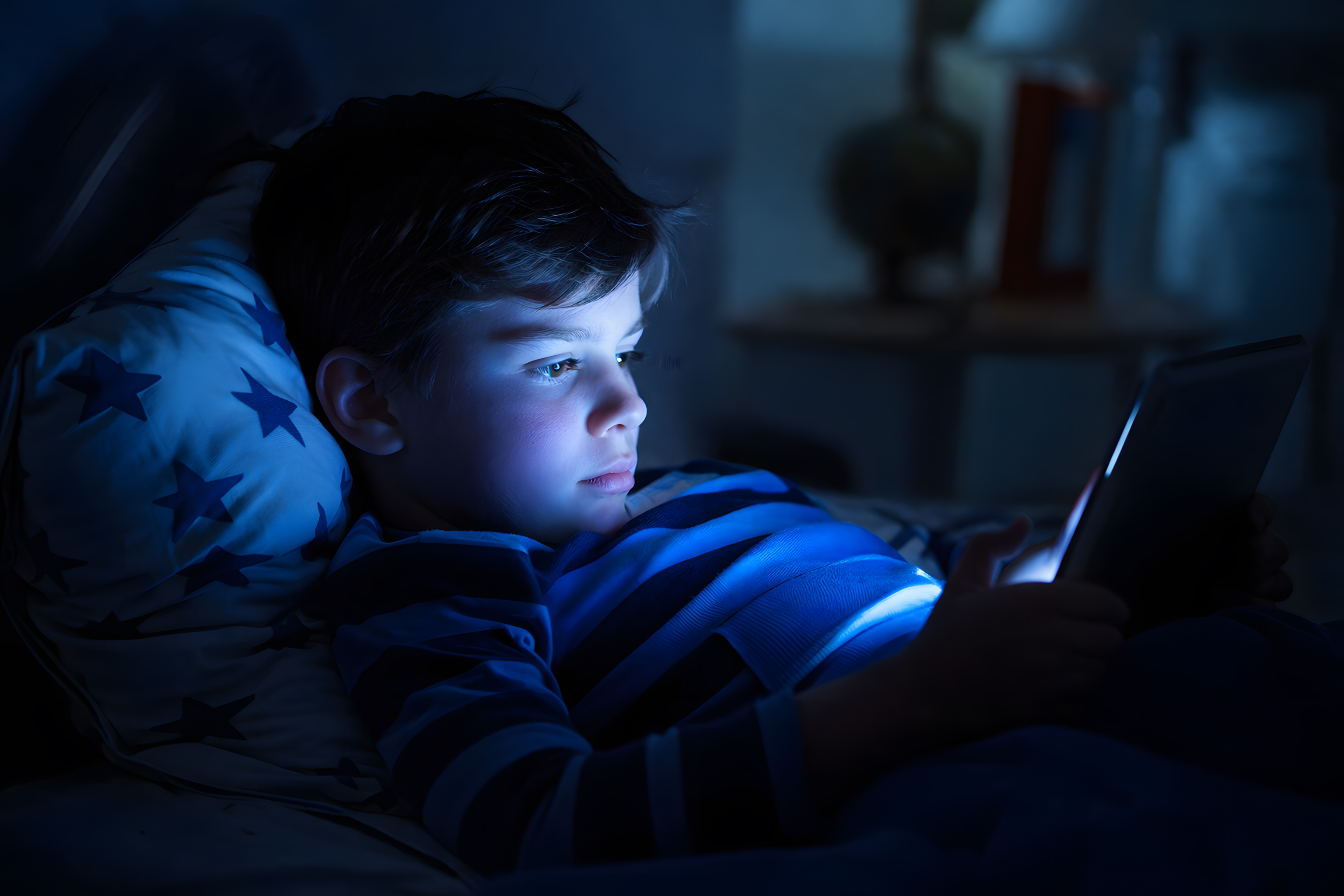 Das Foto zeigt einen jugendlichen Jungen, der konzentriert auf sein Smartphone blickt. Die Szene ist in ein bläuliches Licht getaucht, das vom Bildschirm des Geräts ausgeht. Der Hintergrund ist dunkel und unscharf, was den Fokus auf den Jugendlichen lenkt. Die Beleuchtung und Perspektive kreieren eine ruhige, nachdenkliche Stimmung. Dieses Bild könnte gut in Artikeln über Jugendkultur, digitale Suchtgefahr oder Schlafprobleme durch blaues Licht eingesetzt werden. Es vermittelt sowohl Einblicke in die Lebenswelt der heutigen Jugend als auch die möglichen Folgen übermäßiger Smartphone-Nutzung.