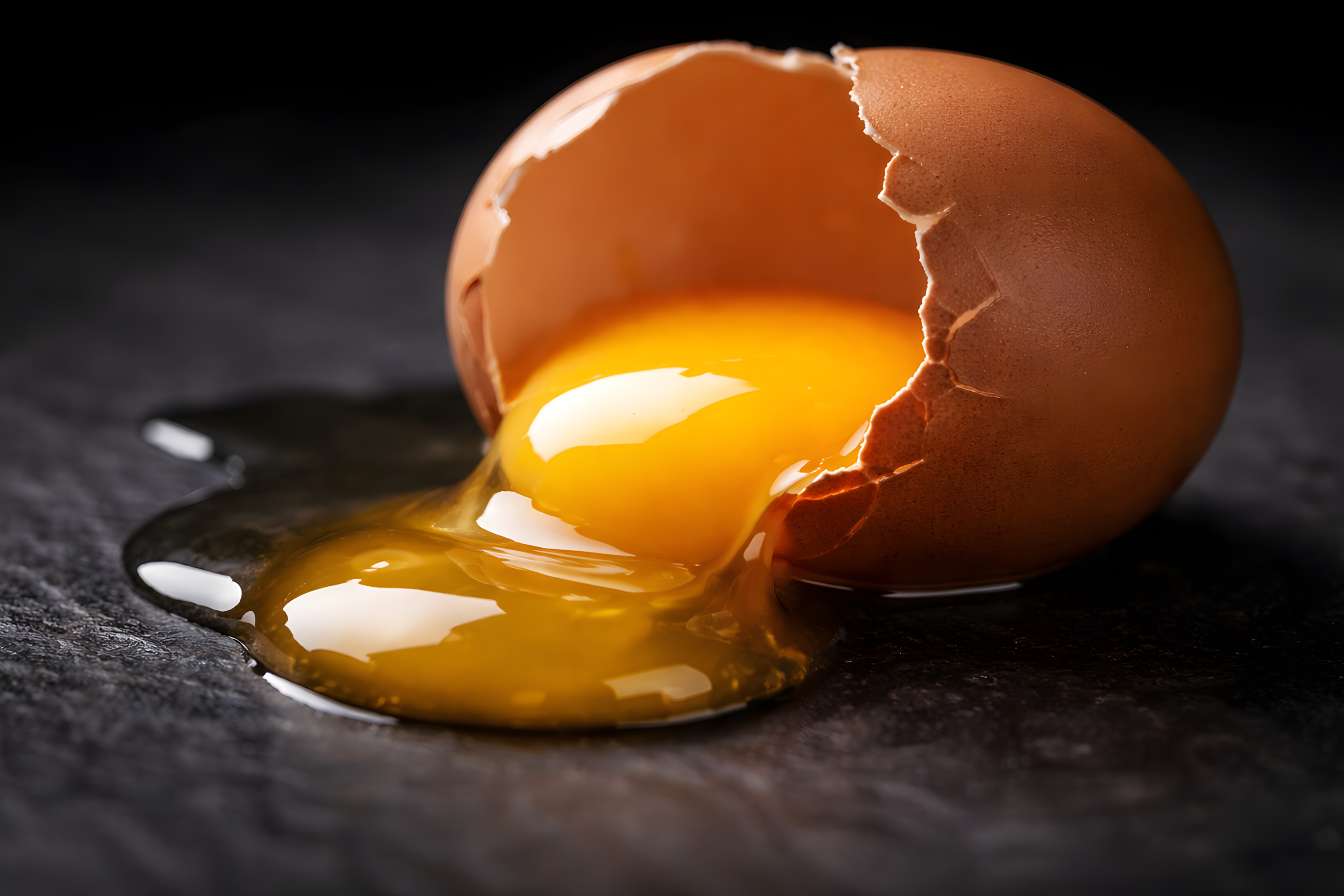 Das Bild zeigt ein zerbrochenes Hühnerei mit einem intensiv gelben Dotter auf einer dunklen Oberfläche. Die zerbrochene Eierschale lässt den Blick auf den leuchtend orangen Dotter frei, der sich auf der schwarzen Fläche abhebt. Die Nahaufnahme unterstreicht die feine Textur und den Kontrast zwischen den verschiedenen Elementen. Dieses Motiv eignet sich hervorragend für Rezepte, Kochbücher, Lebensmittelfotos oder Blogbeiträge rund um das Thema Frühstück, Kochen und Backen. Mit seinem minimalistischen Stil und der Farbgebung lässt es sich auch für Präsentationen, Newsletter oder Social-Media-Beiträge nutzen, um Akzente zu setzen und die Aufmerksamkeit des Betrachters zu fesseln.