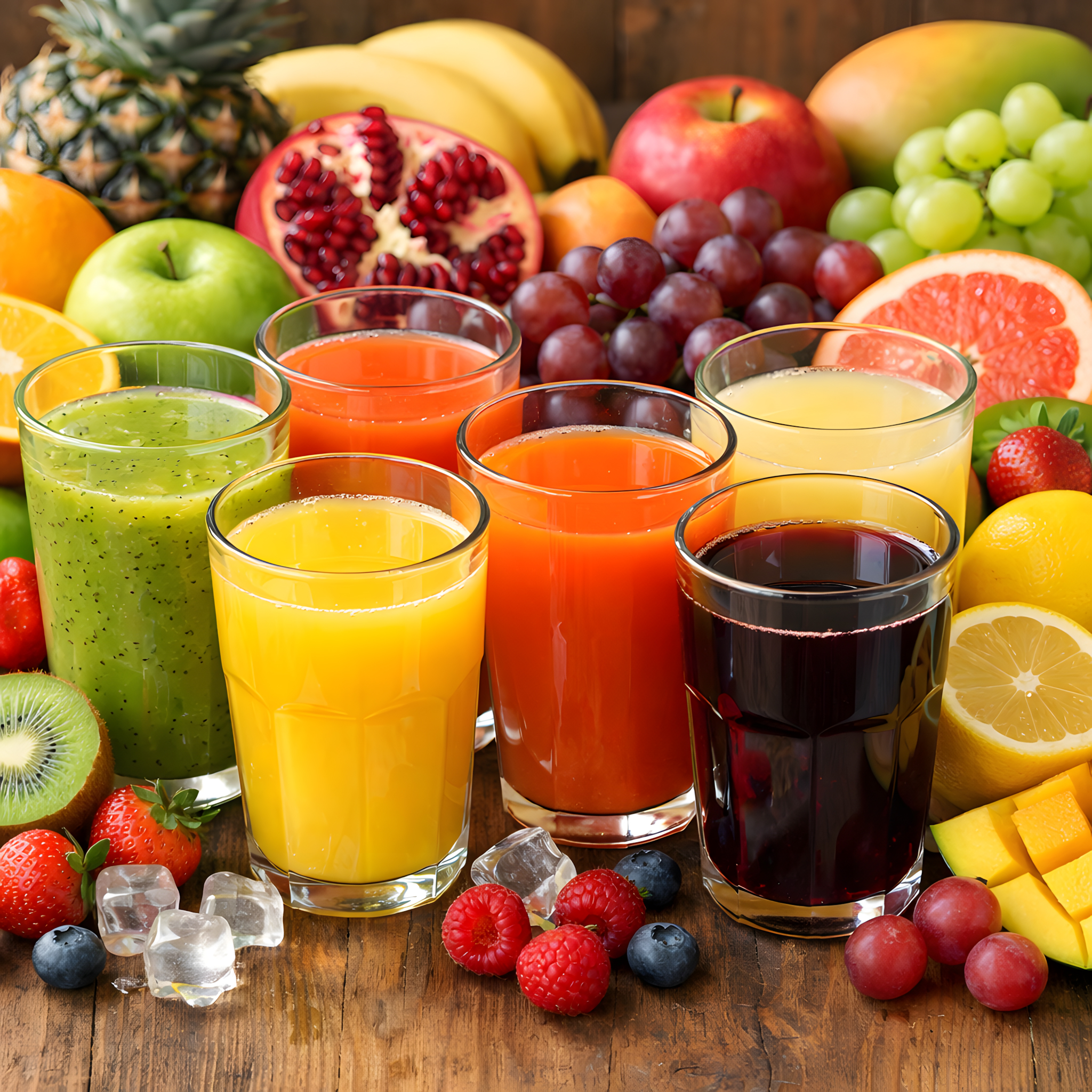 Das Foto zeigt eine Auswahl an leckeren Obst-Smoothies in verschiedenen Farben und Geschmacksrichtungen. Auf einem rustikalen Holztisch sind unterschiedliche Gläser mit grünen, orangefarbenen, roten und gelben Smoothies zu sehen. Dazu sind frische, reife Früchte wie Ananas, Äpfel, Trauben, Orangen, Granatapfel und Beeren platziert. Die Komposition und Farbgebung wirken sehr appetitlich und natürlich. Die Smoothies sind eine gesunde und leckere Erfrischung für heiße Sommertage, ideal für den Genuss auf der Terrasse oder im Garten. Das Bild eignet sich perfekt für den Einsatz in Blogbeiträgen, Social-Media-Posts oder Werbematerialien rund um gesunde Ernährung, Detox-Diäten oder einen aktiven Lebensstil.