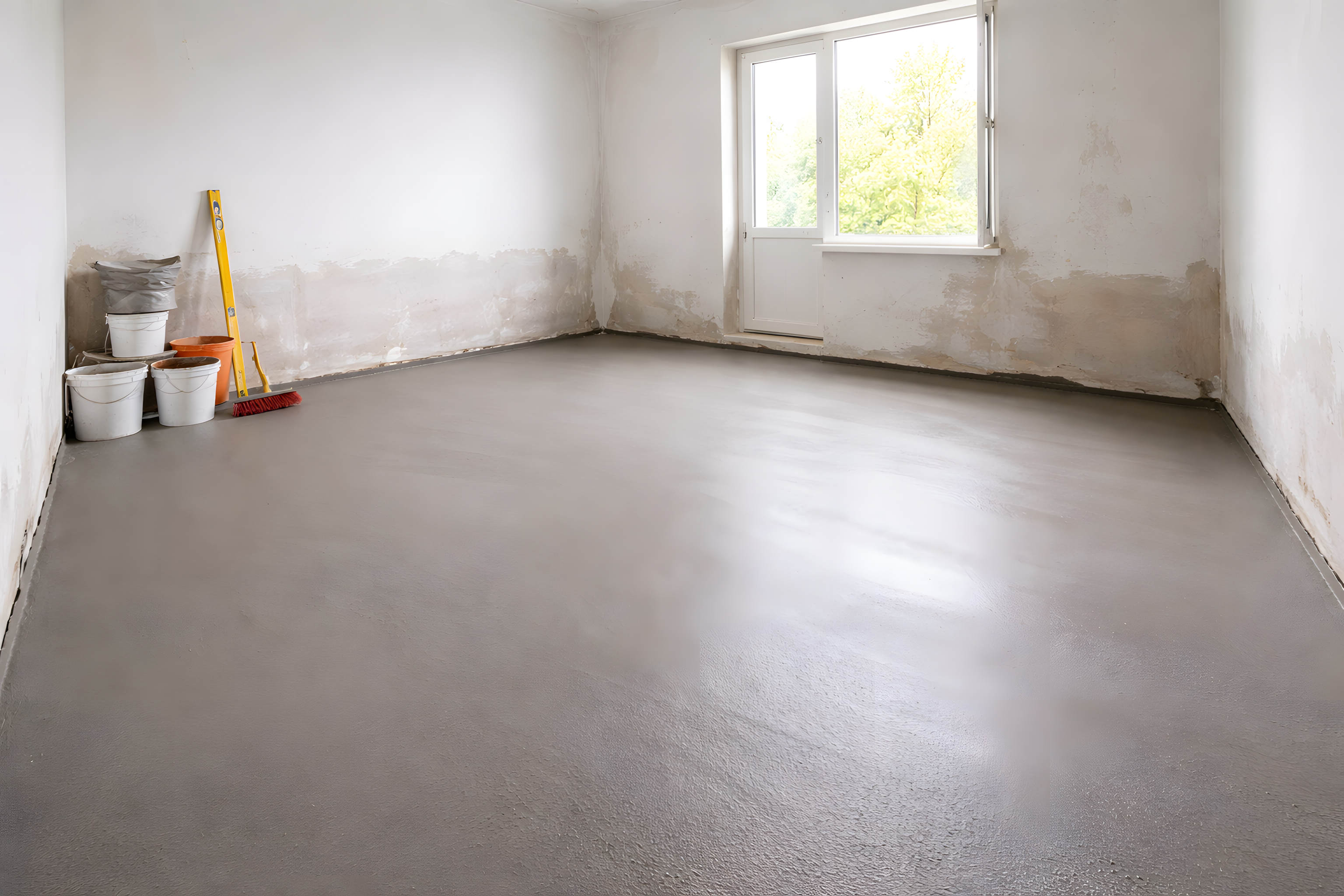 Der große Fensterrahmen lässt viel Tageslicht in den Raum fallen, was den Eindruck von Helligkeit und Weite verstärkt. Im Vordergrund sind verschiedene Werkzeuge, Eimer und andere Utensilien zu sehen, die typisch für Renovierungsarbeiten sind.