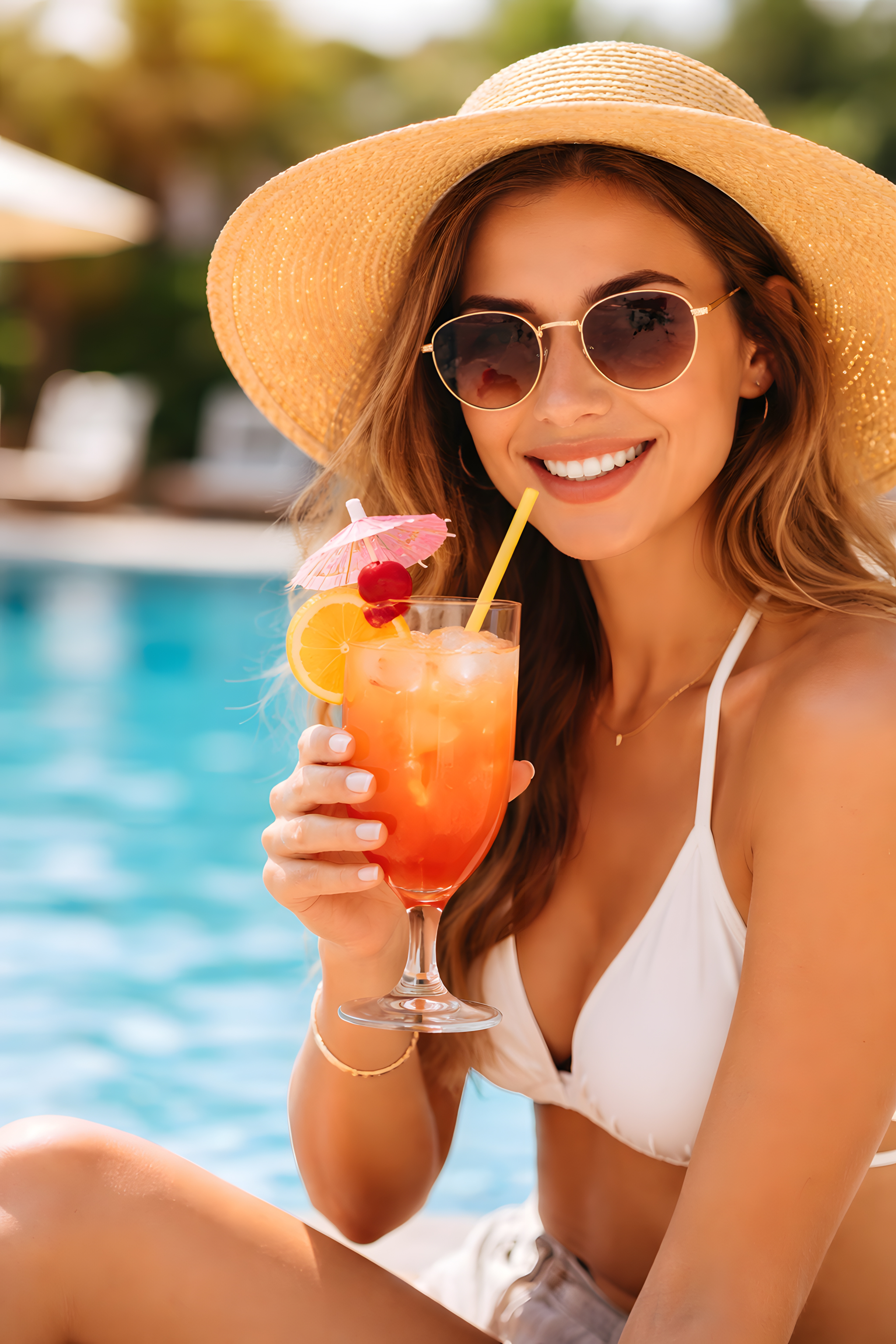 Das Bild zeigt eine junge, lächelnde Frau, die in einem weißen Bikini an einem Pool sitzt und einen bunten Cocktail in der Hand hält. Sie trägt eine große Sonnenbrille und einen breitkrempigen Strohhut, was den sommerlichen, entspannten Charakter der Szene unterstreicht. Der Poolbereich im Hintergrund ist ebenfalls sichtbar und verleiht dem Bild eine schöne, einladende Atmosphäre. Diese Aufnahme eignet sich perfekt für den Einsatz in Beiträgen zu Themen wie Sommerurlaub, Wellness, Reisen oder Lifestyle. Sie kann beispielsweise in Blogs, auf Social-Media-Kanälen oder in Präsentationen verwendet werden, um Stimmungen wie Freude, Erholung und Genuss zu transportieren.