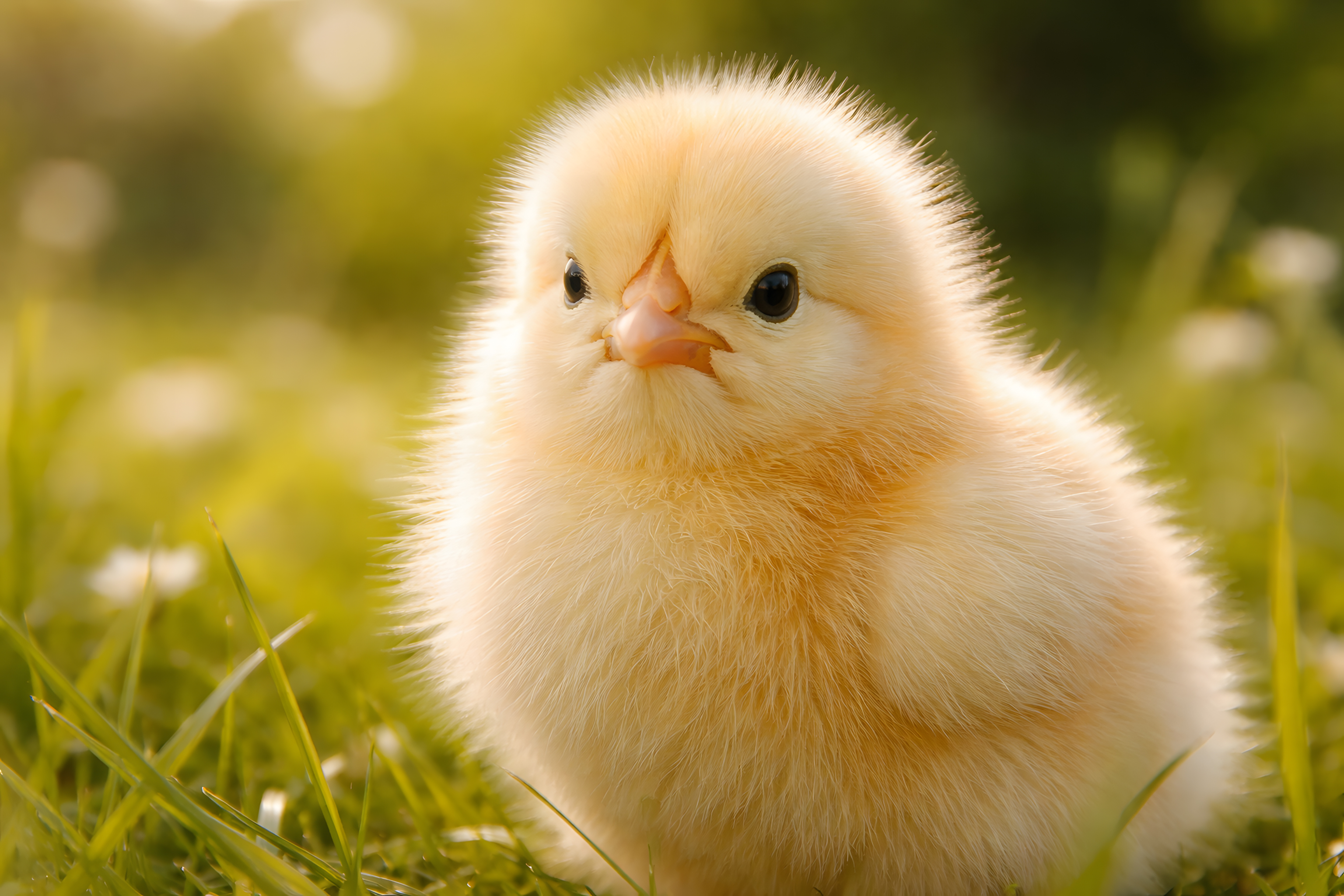 Das Foto zeigt ein bezauberndes gelbes Küken, das auf einer wunderschönen Frühlingswiese sitzt. Das weiche, flauschige Gefieder des Kükens kontrastiert perfekt mit den üppigen grünen Grashalmen und den zarten Blüten, die im warmen Licht erstrahlen. Die unscharfe Perspektive im Hintergrund erzeugt einen stimmungsvollen, fast träumerischen Eindruck. Dieses Bild strahlt pure Natürlichkeit und Freude aus und eignet sich hervorragend für den Einsatz in Blogs, sozialen Medien, Präsentationen oder Newslettern, um Frühlingsgefühle zu wecken und eine positive, harmonische Stimmung zu vermitteln.
