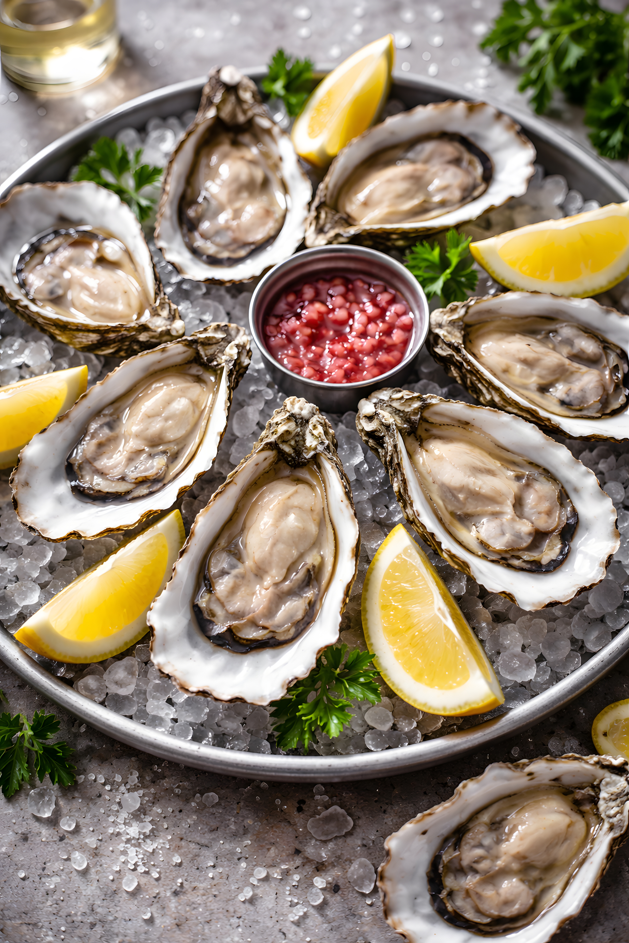 Dieses Foto zeigt eine Anordnung von frischen, glänzenden Austern auf einem Tablett, umgeben von Eiswürfeln. Die Austern sind in der Schale angerichtet und werden durch dekorativ angeordnete Zitronen und einen kleinen Dip-Behälter ergänzt. Die Präsentation vermittelt einen Eindruck von Exklusivität und Genuss, wie er typisch für die Zubereitung und den Verzehr von Meeresfrüchten in gehobenen Restaurants oder bei besonderen Anlässen ist.