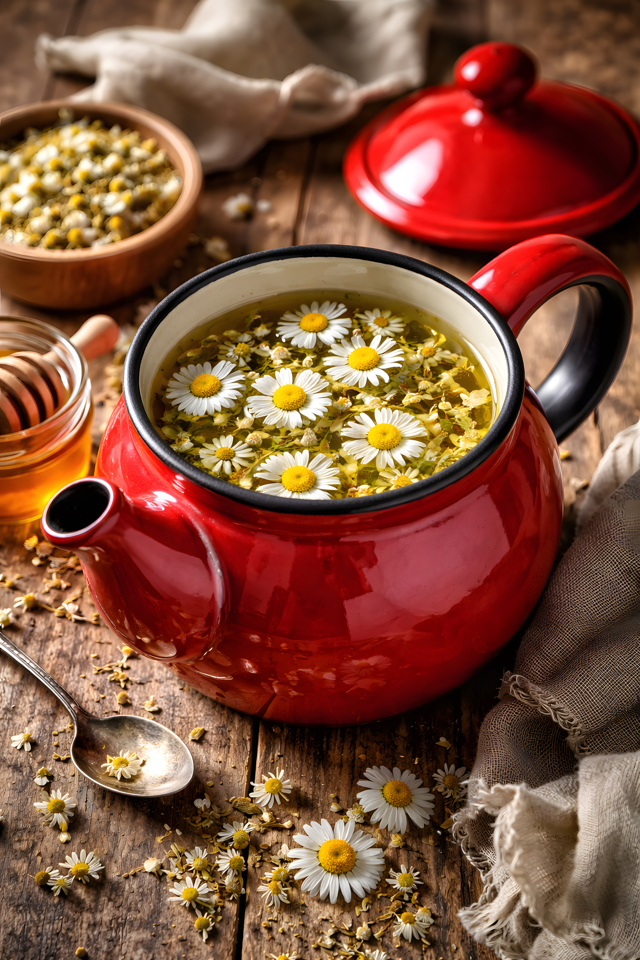 Das Foto zeigt eine rote Teekanne, in der ein aromatischer Kamillenblüten-Tee zubereitet wurde. Die Blüten schwimmen in der goldenen Flüssigkeit und verleihen dem Tee einen natürlichen, beruhigenden Charakter. Umgeben ist die Szene von weiteren Zutaten wie Honig in einem Schälchen und Kräutern in einer hölzernen Schale, die den rustikalen, authentischen Eindruck verstärken. Die warmen Farben, die natürlichen Materialien und die entspannte Komposition laden dazu ein, einen Moment innezuhalten, den Tee zu genießen und zur Ruhe zu kommen. Dieser Kamillenblüten-Tee eignet sich perfekt für einen Blog-Beitrag über gesunde Getränke, einen Instagram-Post zum Thema Wellness und Selbstfürsorge oder auch als visuelle Unterstützung für eine Präsentation zur Naturheilkunde. Mit seinen suchbaren Schlüsselworten wie "Kamillenblüten", "Kräutertee" und "Entspannung" ist das Foto optimal für SEO-optimierte Inhalte geeignet.