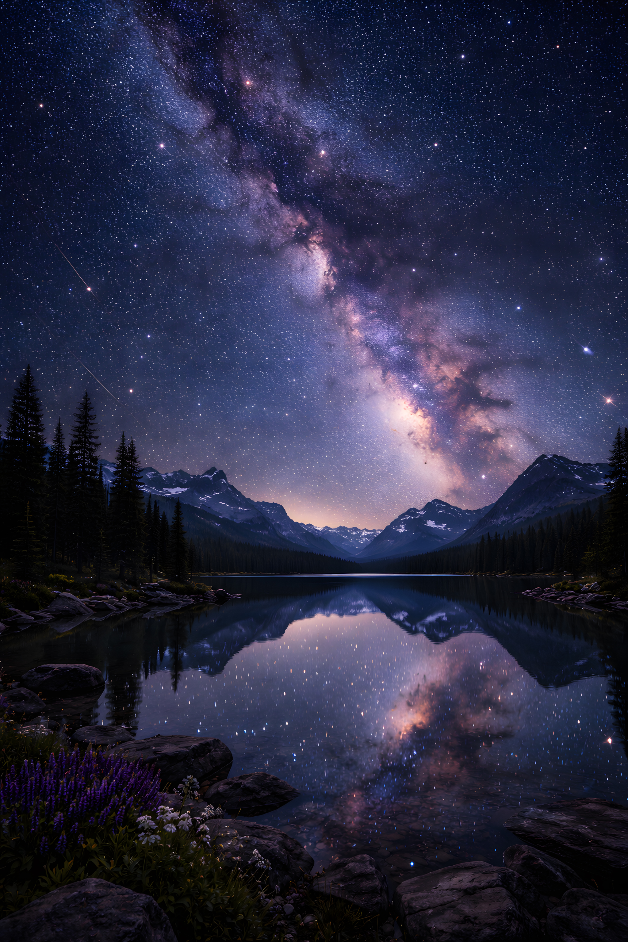 Das Bild zeigt eine atemberaubende Szenerie unter dem Sternenhimmel. Ein ruhiger See spiegelt die Milchstraße und den majestätischen Nachthimmel perfekt wider. Die Bergkulisse im Hintergrund verleiht der Landschaft zusätzliche Tiefe und Mystik. Die dunkle Farbe des Wassers, die sanften Lichtreflexionen und die unzähligen Sterne erschaffen eine stimmungsvolle, fast schon mystische Atmosphäre. Dieses Foto wäre ein perfekter Hingucker für Blogs, Social-Media-Kanäle, Präsentationen oder Newsletters zum Thema Natur, Fotografie oder Astronomie. Die außergewöhnliche Perspektive und Komposition machen es zu einem wahren Blickfang, der Betrachter in seinen Bann zieht und Gefühle von Ruhe, Weite und Faszination hervorruft.