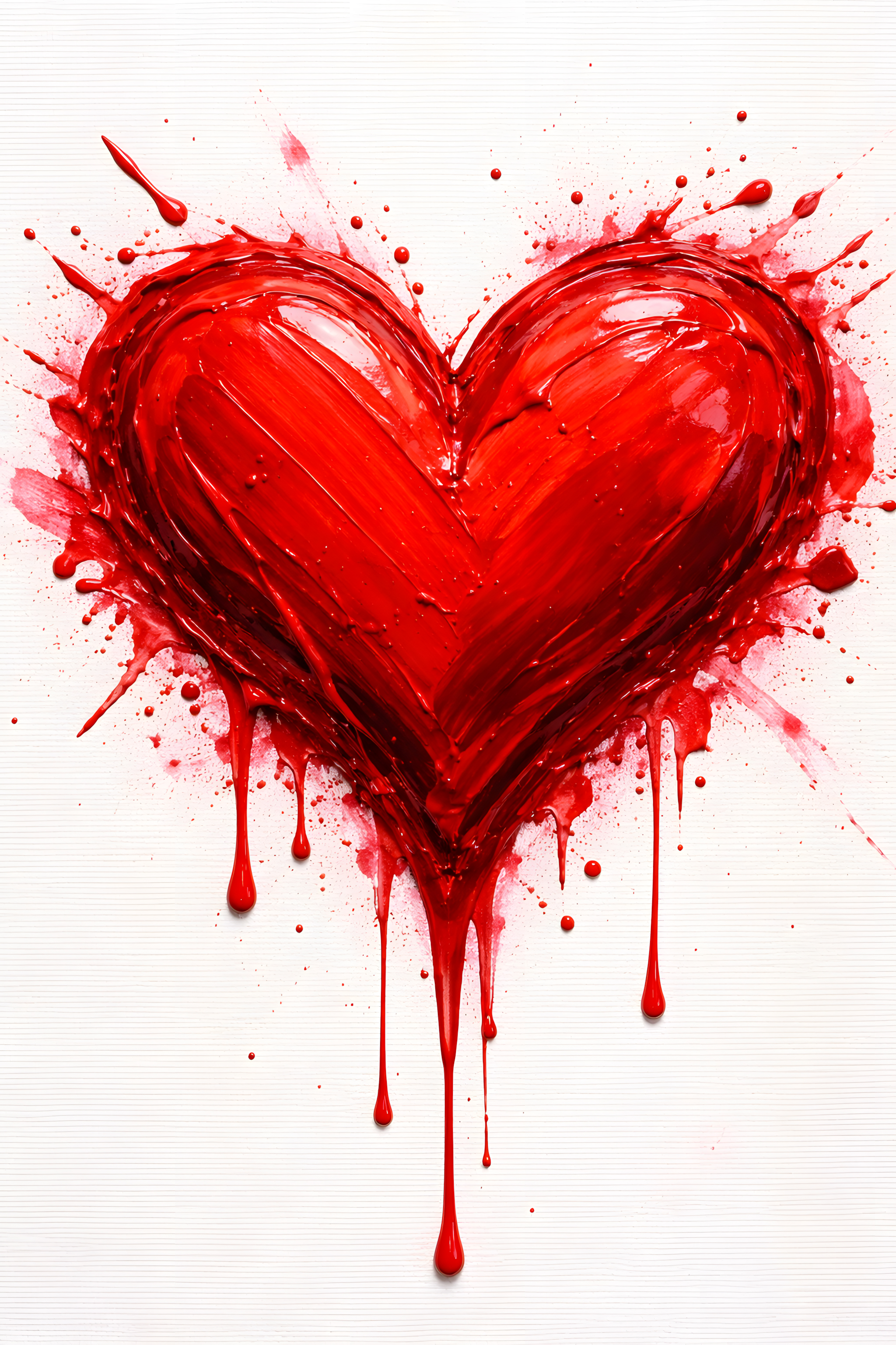Dieses Bild zeigt ein expressives, großes Herz-Symbol in kräftigem Rot. Der Herzumriss wurde in flüssiger, lebendiger Pinselführung gemalt und ist von farbigen Spritzern und Klecksen umgeben, die dem Motiv eine dynamische, fast dreidimensionale Wirkung verleihen. Die Farbgestaltung in verschiedenen Rottönen, vom satten Karmesinrot bis hin zu zarten Rosatönen, erzeugt einen starken, emotionalen Effekt. Das Herzfragment ist vor einem weißen Hintergrund platziert, wodurch es umso prägnanter und ausdrucksstark wirkt. Dieses Motiv eignet sich ideal für Anwendungen im Bereich der Liebe, Leidenschaft und Romantik, z.B. als Titelbild für Blogbeiträge, Poster oder Grußkarten zum Valentinstag oder anderen Anlässen. Die Farbintensität und abstrakte Gestaltung machen es auch zu einem spannenden Element für visuelle Kampagnen in den sozialen Medien oder in der Werbung.