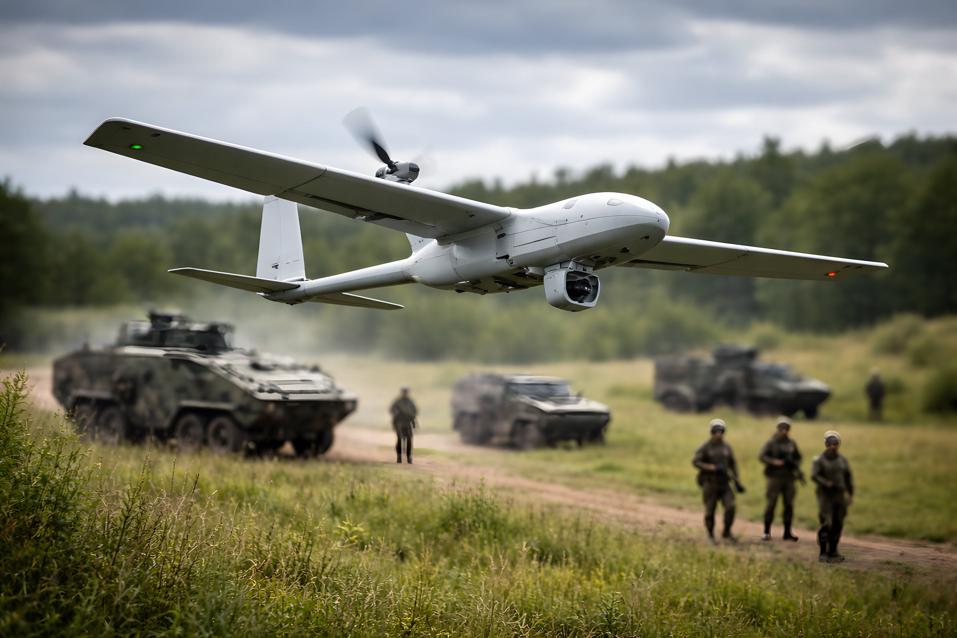 Das Bild zeigt eine Militärdrohne, die über einer Waldlandschaft fliegt, in der sich eine Reihe von Panzern und Soldaten befinden. Die Drohne ist in der Luft und hat eine aerodynamische Form, die auf ihre hohe Geschwindigkeit und Manövrierfähigkeit hinweist. Die Soldaten und Panzer auf dem Boden deuten auf eine Armeeübung hin, bei der die Drohne wahrscheinlich für Aufklärungszwecke oder Luftunterstützung eingesetzt wird. Die düstere, bewölkte Stimmung des Himmels verleiht der Szene eine bedrohliche Atmosphäre und unterstreicht den militärischen Kontext.