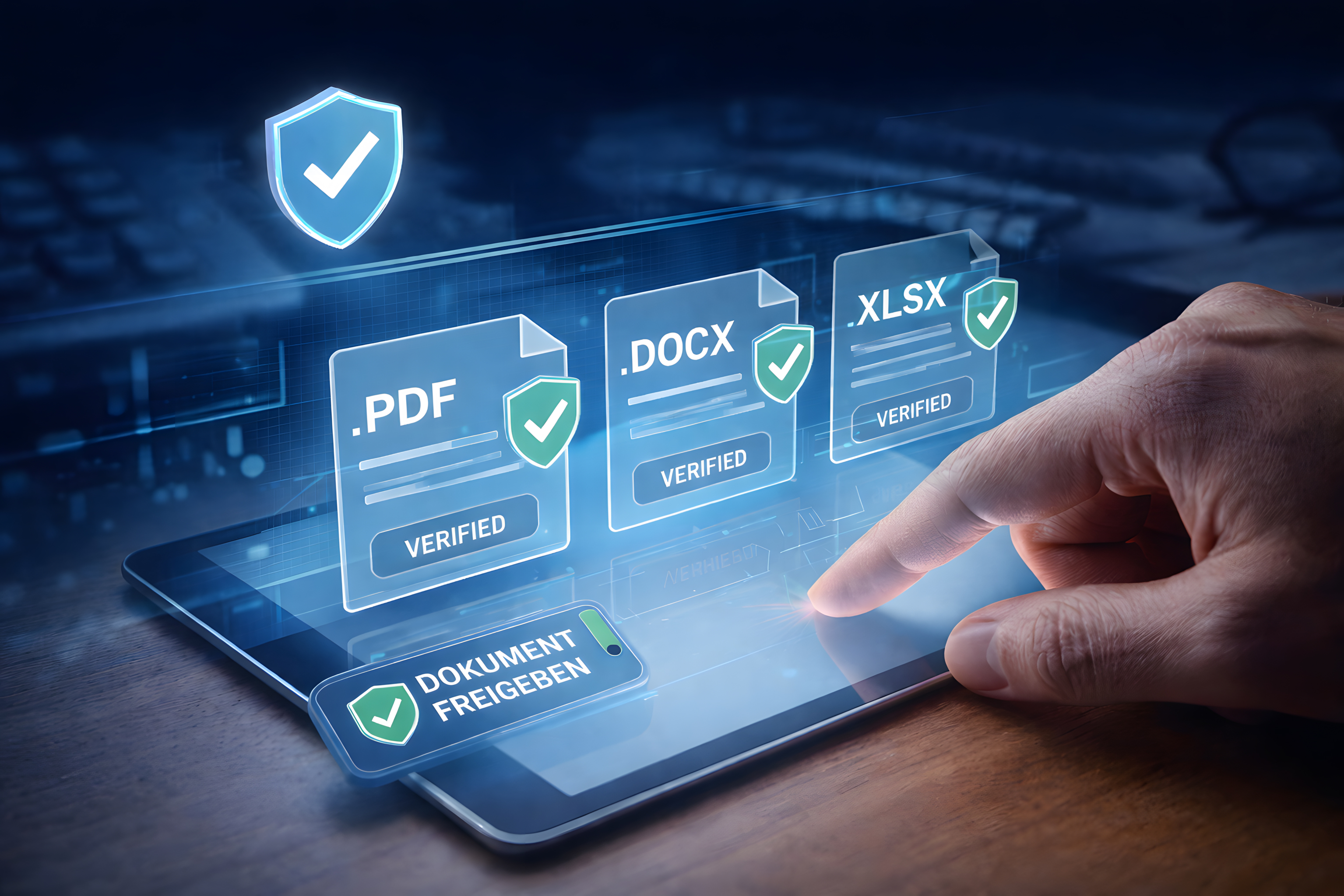 Das Bild zeigt eine digitale Dokumentenmanagement-Lösung, die auf einem Tablet-Computer dargestellt wird. Im Vordergrund sehen wir verschiedene Dateiformate wie PDF, DOCX und XLSX, die jeweils mit einem Prüfhaken-Symbol als verifiziert gekennzeichnet sind. Dies deutet auf eine Funktion zur Überprüfung und Validierung der Dokumente hin.