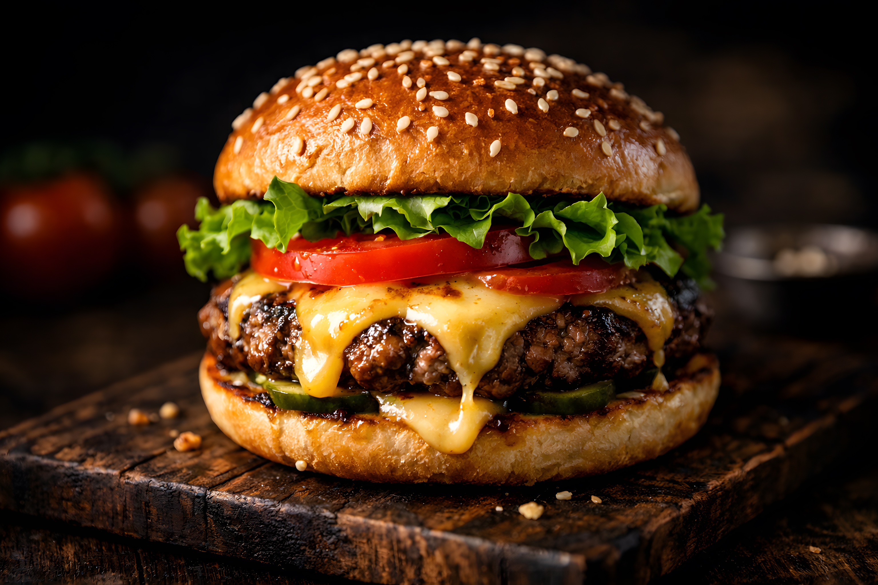 Dieses Foto zeigt einen appetitlichen Burger mit saftigen Fleischlaibchen, geschmolzenem Käse, knackigem Salat und reifen Tomaten. Das Brötchen ist goldbraun getoastet und mit Sesam bestreut. Der Burger steht auf einem rustikalen Holzbrett vor einem dunklen Hintergrund, wodurch die Zutaten perfekt zur Geltung kommen. Diese Aufnahme eignet sich hervorragend für Werbung, Präsentationen oder die Verwendung in Blogs und sozialen Medien rund um das Thema Burger, Fast Food und Gastronomie. Mit den richtigen Schlagwörtern lässt sich diese Aufnahme optimal für SEO-Zwecke einsetzen.
