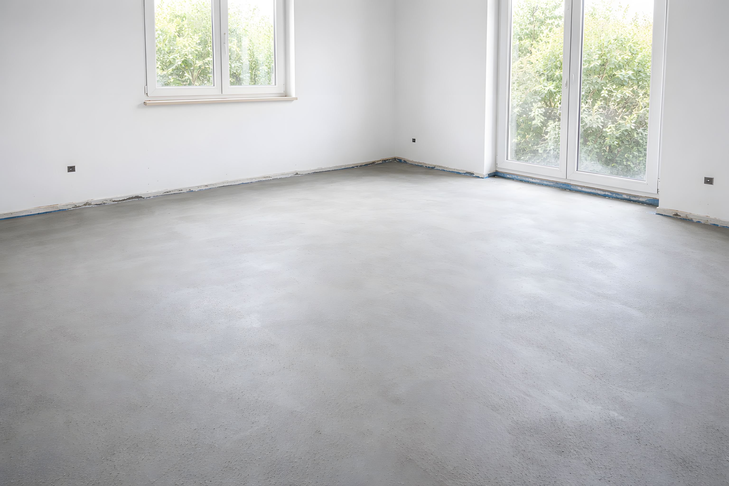 Dieses moderne Büroraum-Bild zeigt einen großzügigen Raum mit hellen Wänden, hohen Fenstern und einem offenen, minimalistischen Grundriss. Der Blick fällt auf den schlichten, grauen Betonboden, der eine ruhige und konzentrierte Arbeitsumgebung schafft. Die Panoramafenster lassen viel Tageslicht in den Raum und bieten eine angenehme Aussicht nach draußen, was die Produktivität und Kreativität der Mitarbeiter fördern kann.