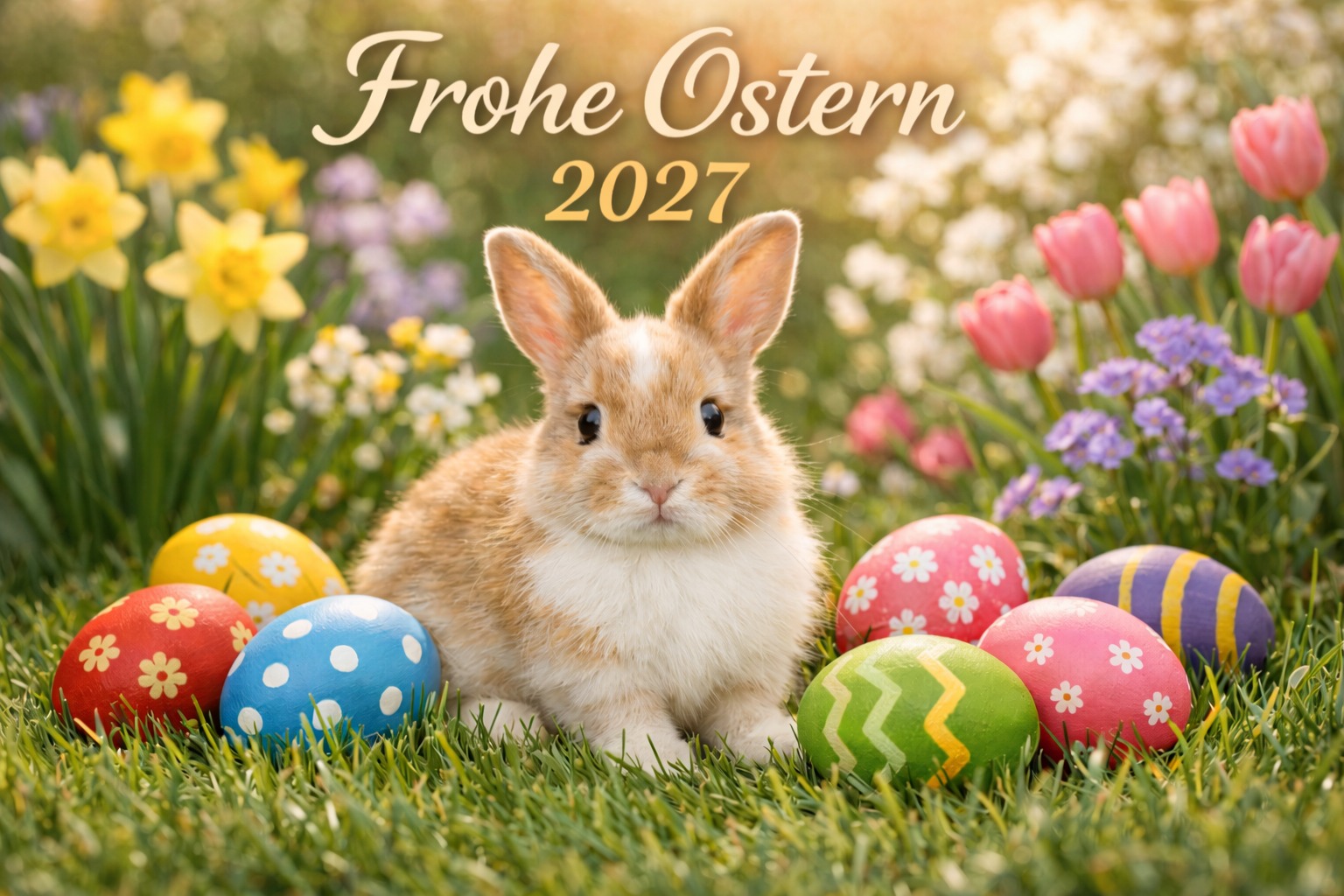 Dieses idyllische Osterfoto zeigt einen süßen, pelzigen Hasen, der zwischen bunten Frühlingsblumen auf einer Wiese sitzt. Im Vordergrund sind bunte, bemalte Ostereier in verschiedenen Farben und Mustern verstreut, die eine festliche Atmosphäre schaffen. Im Hintergrund sind gelbe Narzissen und rosa Tulpen zu sehen, die dem Bild einen frischen, fröhlichen Charakter verleihen.