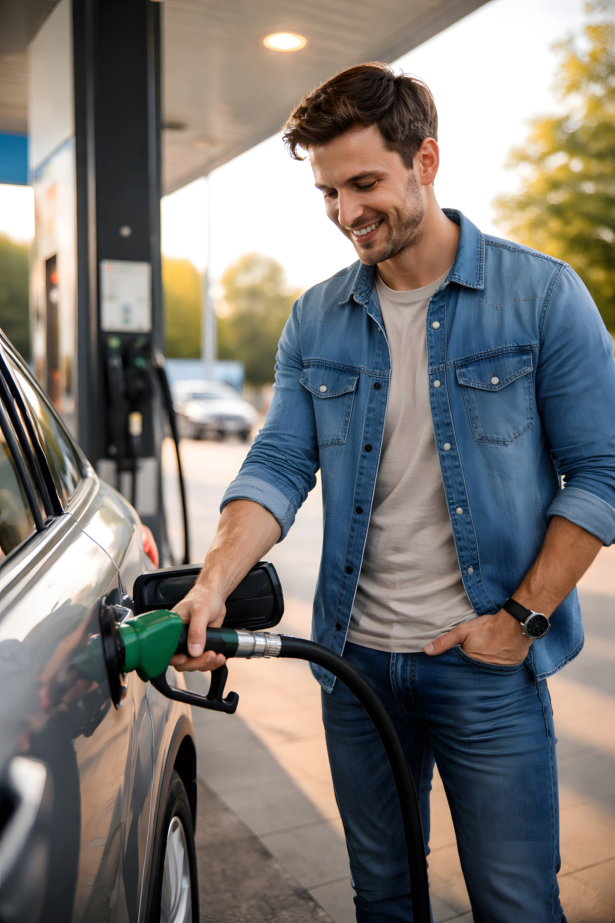 Das Foto zeigt einen jungen, lächelnden Mann, der gerade an einer Tankstelle Benzin in sein Fahrzeug füllt. Er trägt eine legere Jeansjacke und sieht entspannt und zufrieden aus. Die Perspektive ist nah und konzentriert sich auf den Mann, während im Hintergrund eine Szenerie mit anderen Autos und einer Tankstelle zu sehen ist. Das Bild vermittelt einen modernen, städtischen Lebensstil und die Freude an der individuellen Mobilität. Es kann für verschiedene Kontexte eingesetzt werden, etwa in Blogs über Reisen, urbanes Leben oder als Werbefoto für Automobilhersteller, Tankstellen oder Energieversorger.