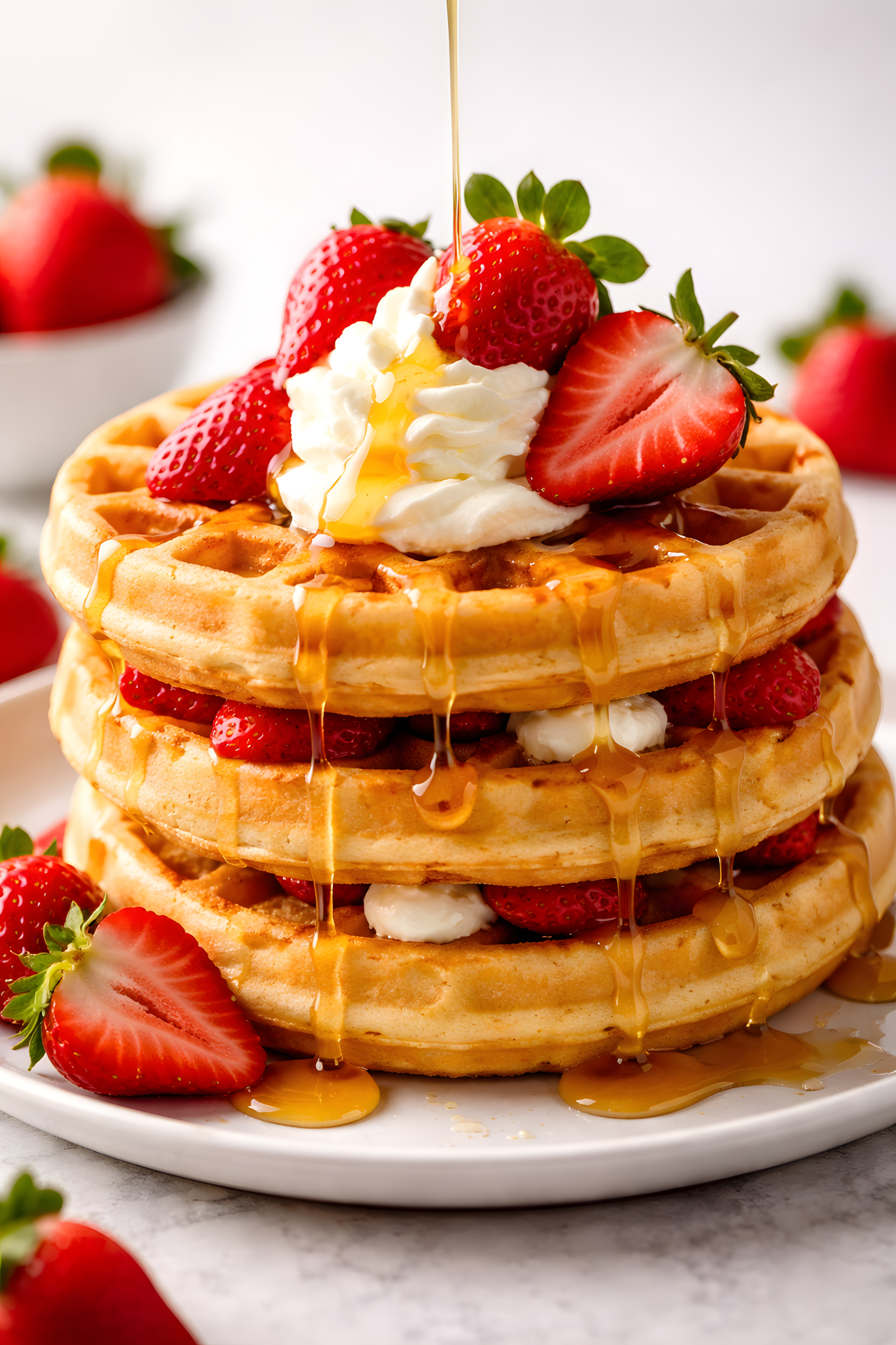 Dieses verlockende Foto zeigt einen Stapel knuspriger Waffeln, die mit frischen Erdbeeren, Sahne und süßem Sirup belegt sind. Die kräftig roten Früchte und die goldgelbe Waffelstruktur bilden einen wunderbaren Kontrast. Die Perspektive ist leicht erhöht, sodass der Betrachter einen guten Blick auf das köstliche Dessert hat. Das Arrangement ist appetitlich und lädt förmlich zum Genießen ein. Dieses Bild wäre ideal für Blogbeiträge, Social-Media-Posts oder Newsletter rund um das Thema Backen, Frühstück oder Süßspeisen. Mit den saisonalen Schlüsselbegriffen wie Erdbeeren und Waffeln lässt es sich außerdem hervorragend für SEO-Optimierung einsetzen.