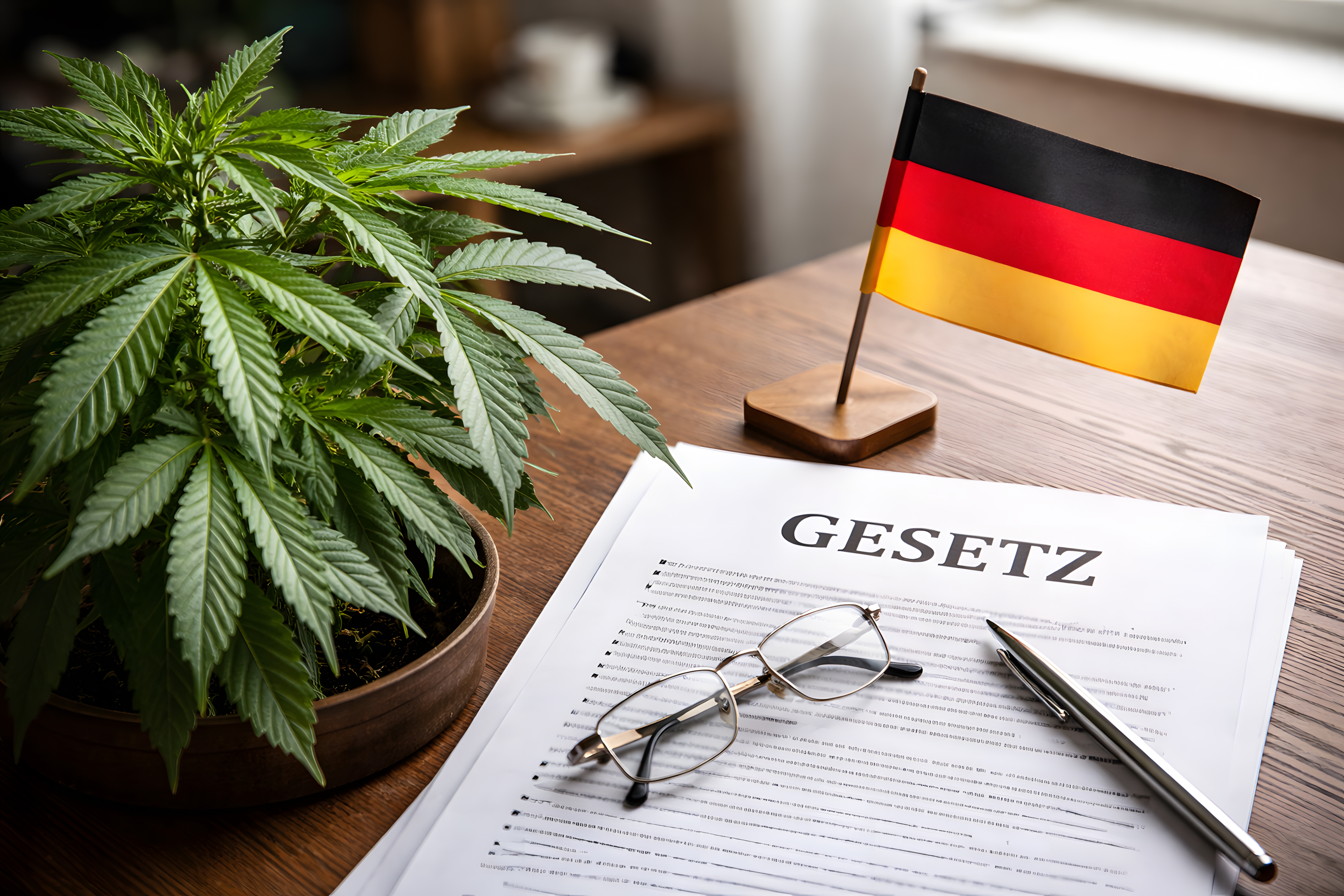 Das Foto zeigt einen Bürotisch, auf dem verschiedene Elemente rund um das Thema legale Cannabis-Gesetzgebung in Deutschland platziert sind. Im Vordergrund befindet sich ein Dokumentenstapel mit der Aufschrift «Gesetz», darauf liegen eine Brille und ein Stift. Daneben steht eine kleine deutsche Flagge. Im Hintergrund ist eine üppige Cannabispflanze zu sehen, die für die medizinische und industrielle Nutzung der Droge steht.