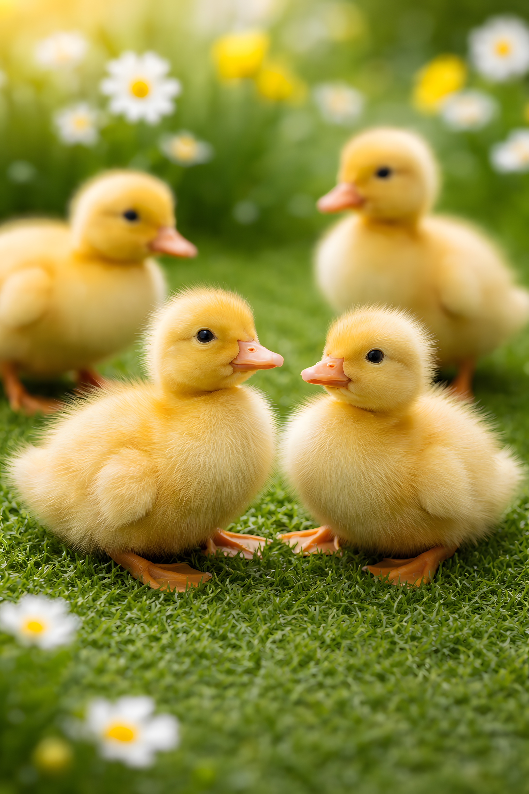 Das Foto zeigt eine entzückende Gruppe von jungen Entenküken, die auf einer üppigen, grünen Wiese umherwatscheln. Die gelbflaumigen Babytiere wirken mit ihren großen, schwarzen Augen und den farbenfrohen Federn unglaublich süß und niedlich. Der Hintergrund des Bildes ist verschwommen, sodass der Fokus ganz auf den Enten liegt. Die Komposition ist dabei sehr ausgewogen und harmonisch - die Küken sind in einem natürlichen Rahmen aus Gras, Blumen und Sonnenlicht platziert. Dieses Foto eignet sich hervorragend für den Einsatz in Blogbeiträgen, Social-Media-Kanälen oder Präsentationen, die ein fröhliches, natürliches und liebevolles Ambiente vermitteln möchten. Es verbreitet pure Lebensfreude und lässt den Betrachter schmunzeln.