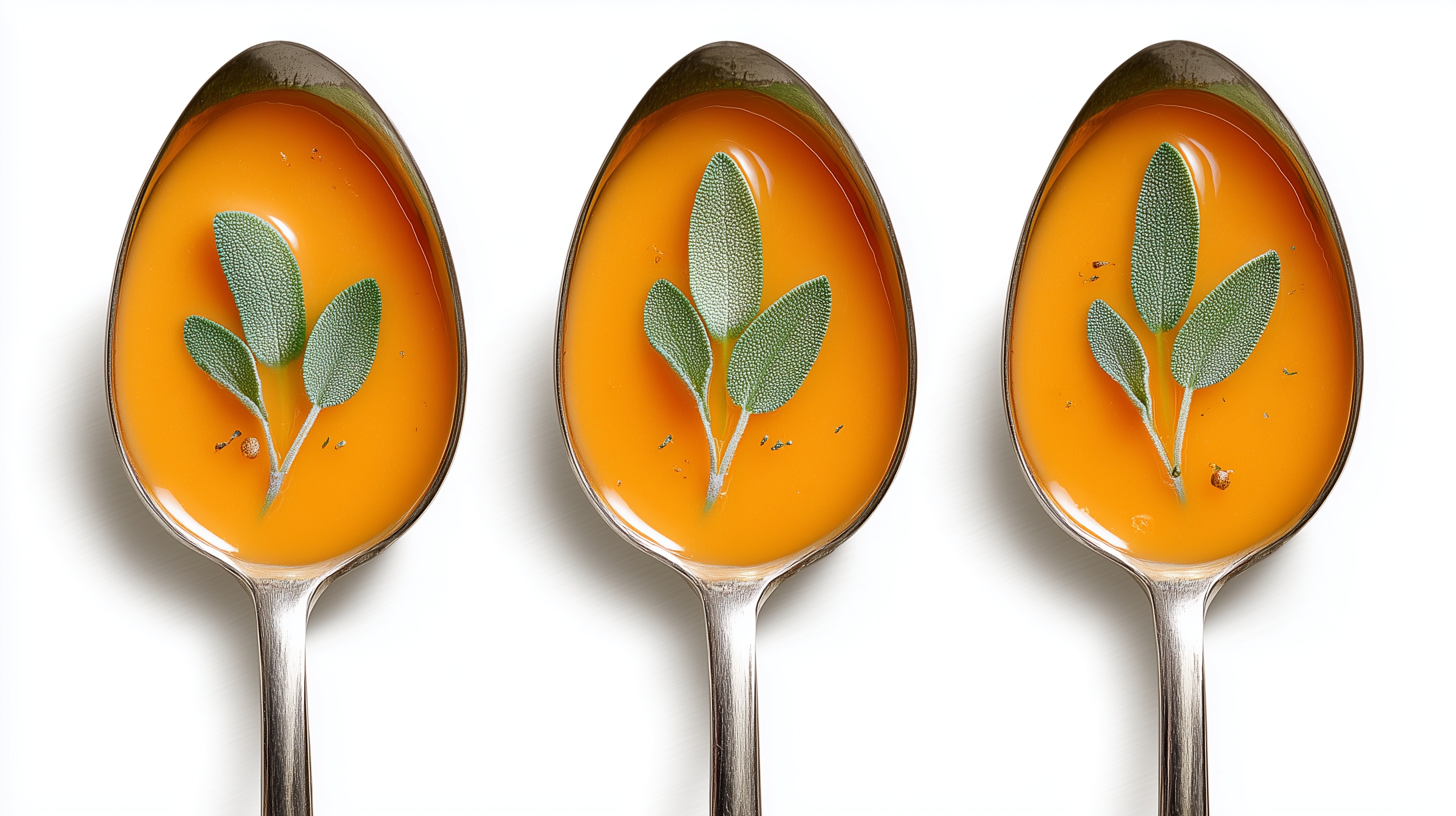 In diesem stimmungsvollen Foto sehen wir drei Löffel, gefüllt mit einer satten, orangefarbenen Suppe. Darin schwimmen grüne Blätter von Kräutern wie Salbei oder Rosmarin. Die schlichte Komposition und die scharfe Fokussierung auf die Löffel lenken den Blick des Betrachters direkt auf das Wesentliche - die appetitliche Speise. Die warme, einladende Farbpalette aus Orange und Grün verspricht eine würzige, nahrhaft-gesunde Mahlzeit. Dieses Bild eignet sich hervorragend als Eyecatcher in Blogbeiträgen, Social-Media-Posts oder Werbe-Materialien rund um gesunde Ernährung, Kochen und Lebensmittel. Es vermittelt Natürlichkeit, Frische und guten Geschmack.