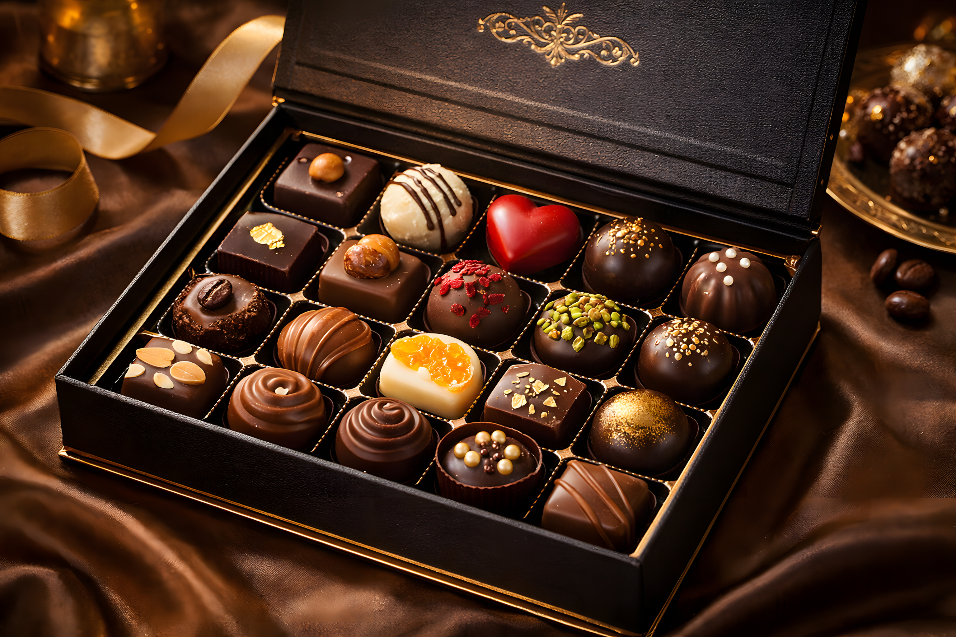 Dieses Foto zeigt eine prachtvolle Auswahl an hochwertigen Pralinen in einer edlen, schwarzen Geschenkbox. Die Pralinenschachtel ist mit einem luxuriösen, goldenen Dekor verziert und präsentiert die einzelnen Schokoladenkonfekte auf eine einladende Weise. Die Pralinen selbst sind in verschiedenen Formen, Farben und Sorten angeordnet, darunter Trüffel, Pralinen mit flüssiger Füllung, Nougat-Varianten und andere köstliche Kreationen. Das Foto strahlt eine elegante, festliche Atmosphäre aus und lässt den Betrachter die Hochwertigkeit und den exklusiven Charakter der Pralinenwahl erahnen. Diese Pralinen-Auswahl eignet sich hervorragend als hochwertiges Geschenk zu besonderen Anlässen wie Weihnachten, Geburtstag oder Valentinstag, um Genießer zu verwöhnen. Auch in Blogs, auf Social-Media-Kanälen oder in Präsentationen lässt sich dieses luxuriöse Motiv stimmungsvoll einsetzen.