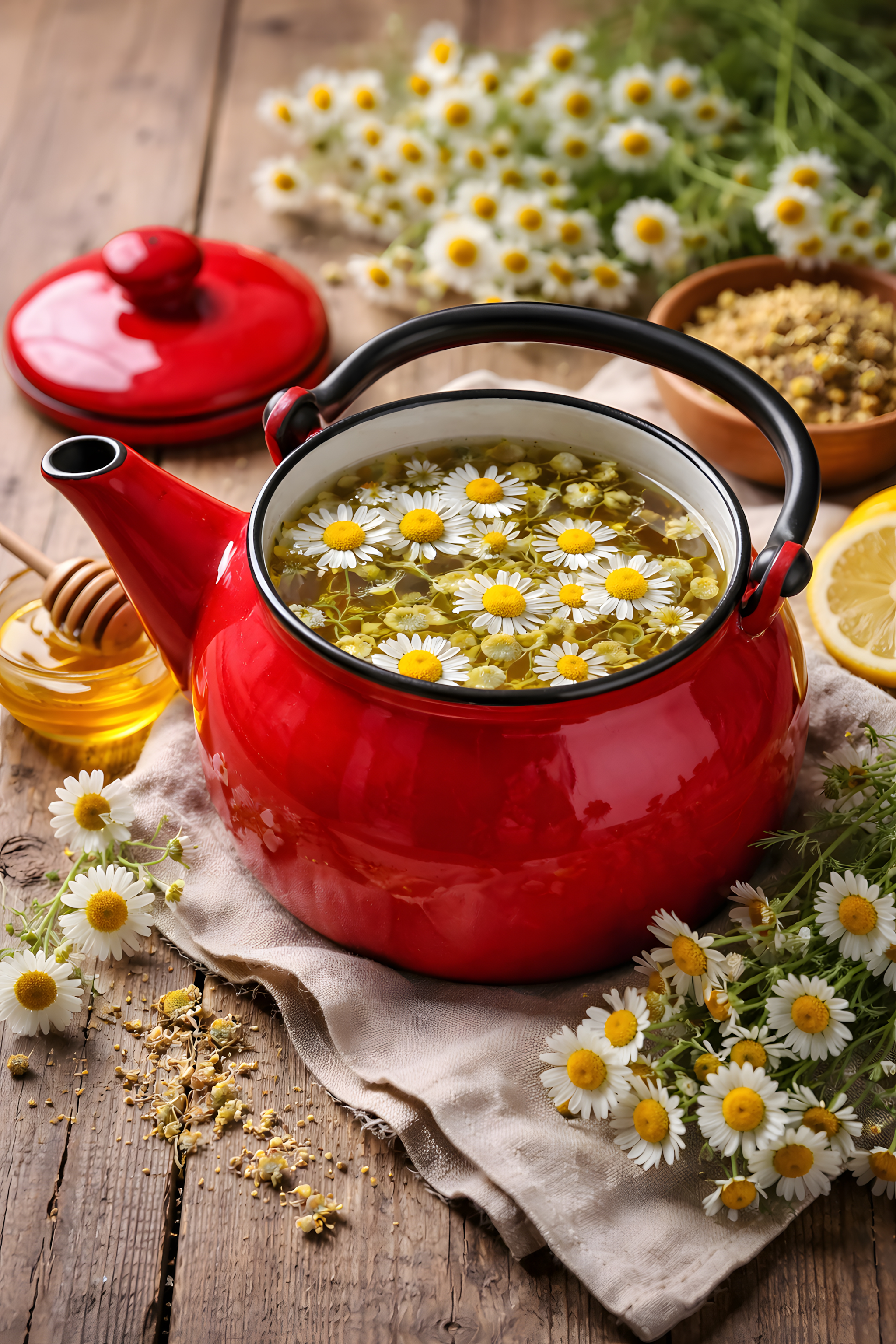 Das Foto zeigt eine rote Teekanne, gefüllt mit Kamillenblüten, die auf einem Holztisch stehen. Umgeben ist die Kanne von verschiedenen Zutaten wie Honig, Zitronenscheiben und weiteren Kamillenblüten. Das Arrangement vermittelt eine natürliche, gemütliche Stimmung und lädt zum entspannten Teegenuss ein. Die Kombination der roten Kanne mit den gelben Blüten und den natürlichen Materialien wirkt harmonisch und einladend. Dieses Foto eignet sich hervorragend für den Einsatz in Blogs, Social-Media-Beiträgen oder Präsentationen zum Thema Teekultur, Entspannung und Gesundheit. Es transportiert Werte wie Natürlichkeit, Wellness und Wohlbefinden auf ästhetische Weise.