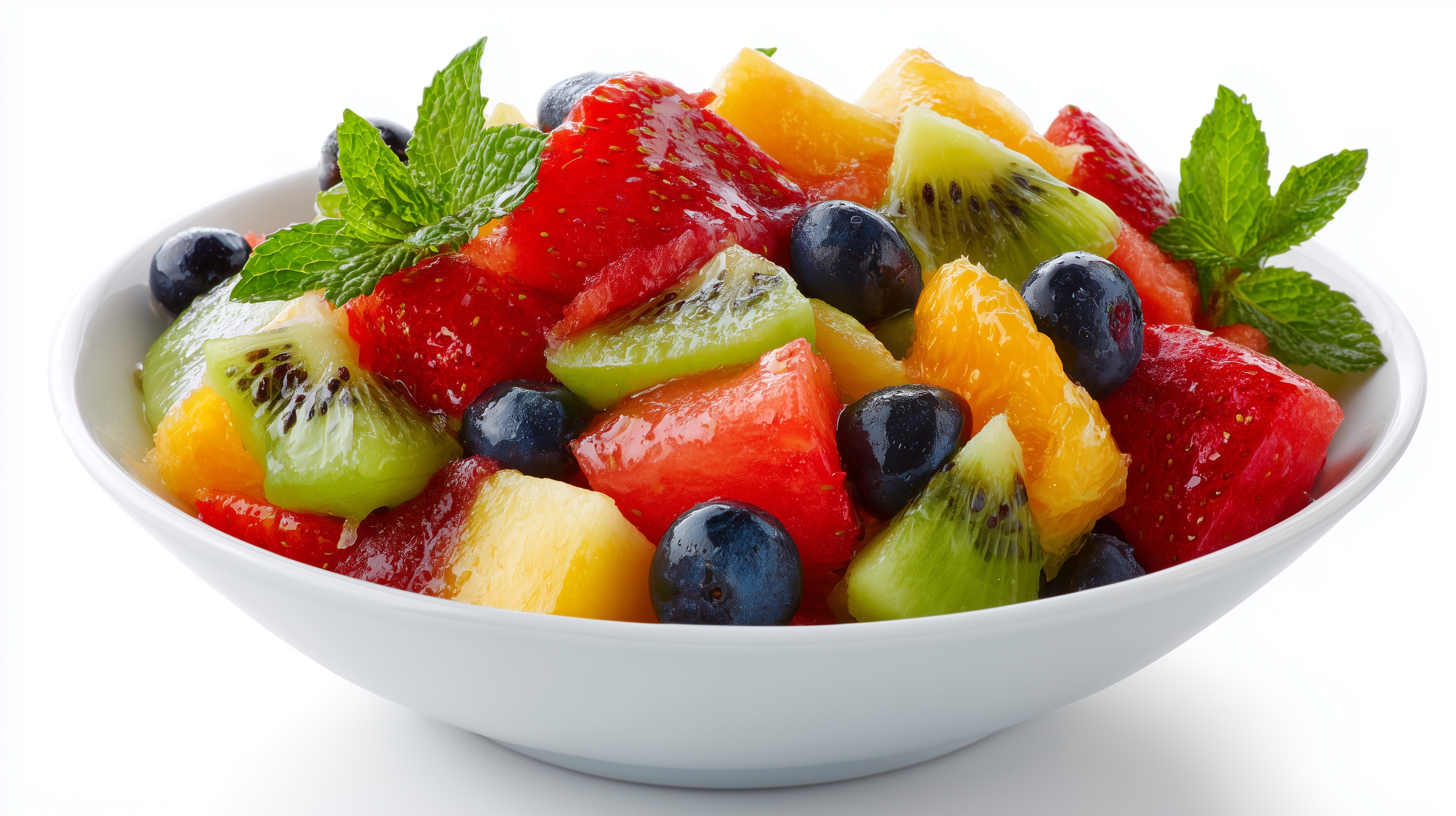 Dieses herrlich bunte Obstsalat-Rezept ist die perfekte Erfrischung an heißen Sommertagen. Mit saftigen Erdbeeren, knackigen Kiwistücken, süßen Orangenscheiben und erfrischenden Blaubeeren entsteht ein Geschmackserlebnis voller Vitamine und Nährstoffe. Die dekorativ angeordneten Früchte in der weißen Schüssel sehen nicht nur appetitlich aus, sondern bringen auch farbenfroh Urlaubsstimmung auf den Tisch. Das Gericht eignet sich hervorragend als leichter Nachtisch, sommerlicher Snack oder als gesunde Bereicherung für Buffets und Partys. Mit der Zugabe von frischer Minze erhält der Obstsalat noch einen erfrischenden Twist. Ob als Beilage zum Grillen, für einen picknickfertigen Salat oder als Quick-Rezept für einen Instagram-Post - dieses schnelle und einfache Obst-Arrangement ist vielseitig einsetzbar und begeistert Groß und Klein.