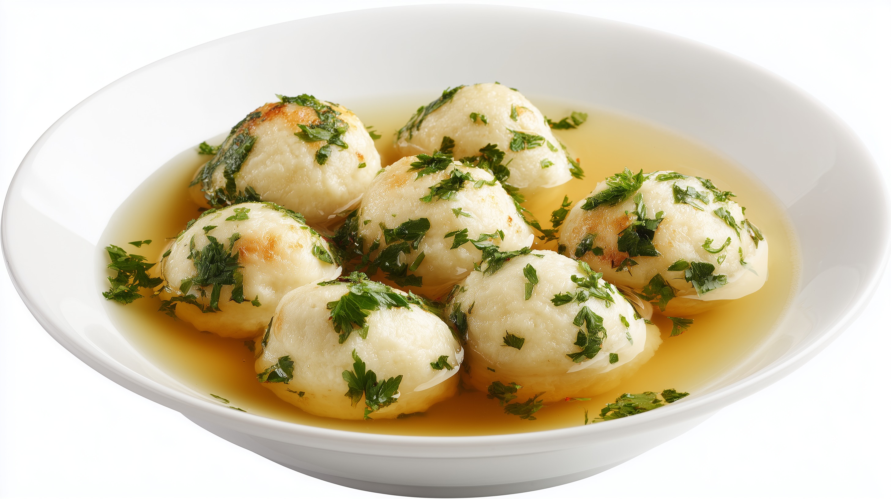 Dieses Foto zeigt ein Gericht voller Köstlichkeiten: delikate Kartoffelklöße, die in einer würzigen, aromatischen Brühe schweben. Die Klöße haben eine cremige, weiche Konsistenz und sind mit frischer, grüner Petersilie dekoriert, die einen schönen Farbkontrast zum Gelb der Brühe bildet. Das Gericht vermittelt ein Gefühl von Gemütlichkeit und Genuss, typisch für die traditionelle Küche Mitteleuropas. Es eignet sich hervorragend als Hauptspeise oder als Beilage zu anderen Gerichten. Mit dieser leckeren Speise können Sie Ihre Gäste begeistern oder Ihren eigenen Appetit stillen. Die Kartoffelklöße in der Brühe sind ein wahrer Genuss für Auge und Gaumen.