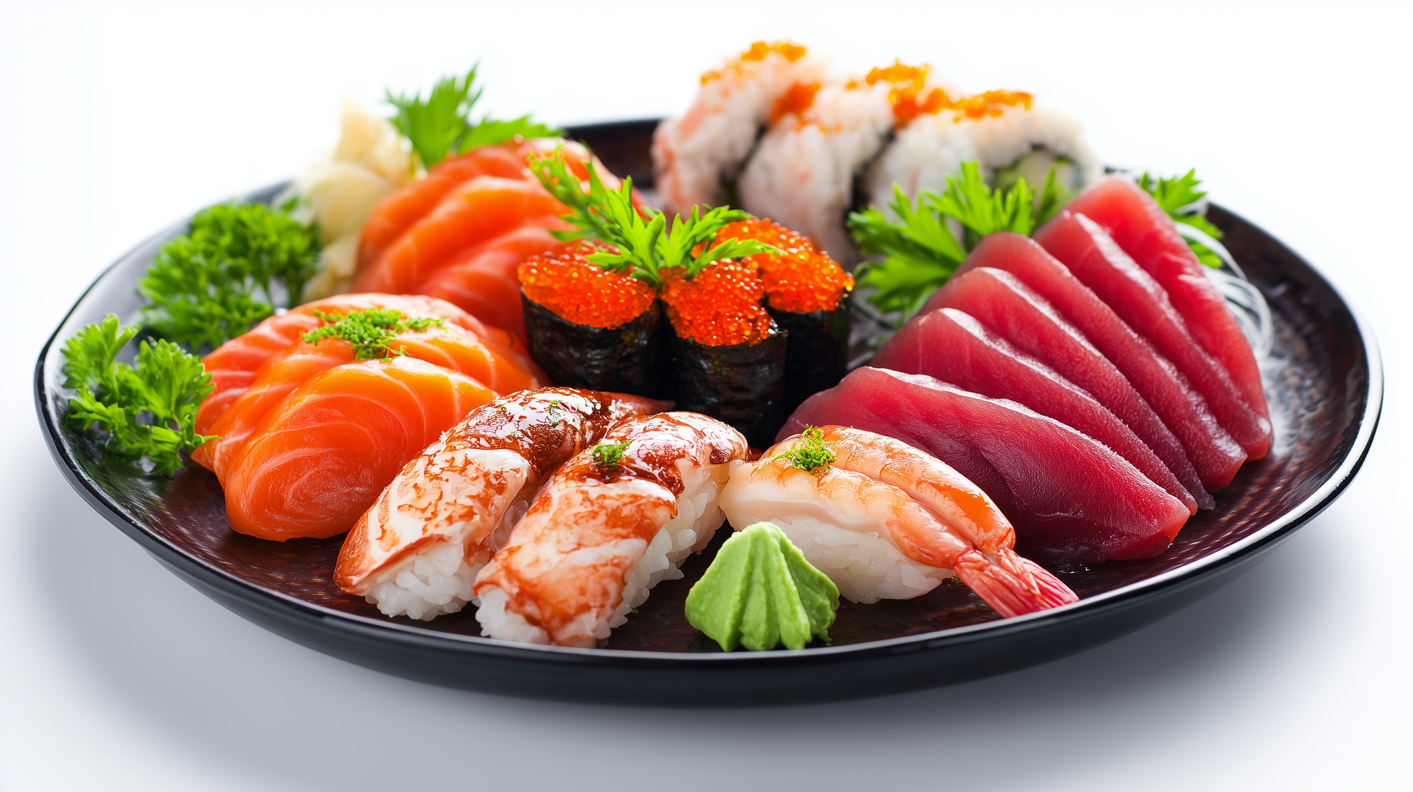 Dieses Foto zeigt ein köstliches japanisches Sushi-Gericht auf einem schwarzen Teller. Es ist eine vielfältige Komposition aus verschiedenen Sushi-Variationen wie Lachs-Nigiri, Thunfisch-Maki und Avocado-Rollen, garniert mit frischen Kräutern und Wasabi-Paste. Die Präsentation ist sehr ansprechend und lädt zum Genuss ein. Die Farbkontraste zwischen dem frischen Grün der Kräuter, den roten Beeten, dem rosa Thunfisch und den orange-roten Lachsstreifen sind äußerst appetitanregend. Dieses Foto wäre perfekt für die Verwendung in Kochrezepten, Beiträgen zu asiatischer Küche oder Präsentationen über japanische Esskultur. Es schafft Lust auf mehr und lässt den Betrachter den Geschmack förmlich auf der Zunge spüren.