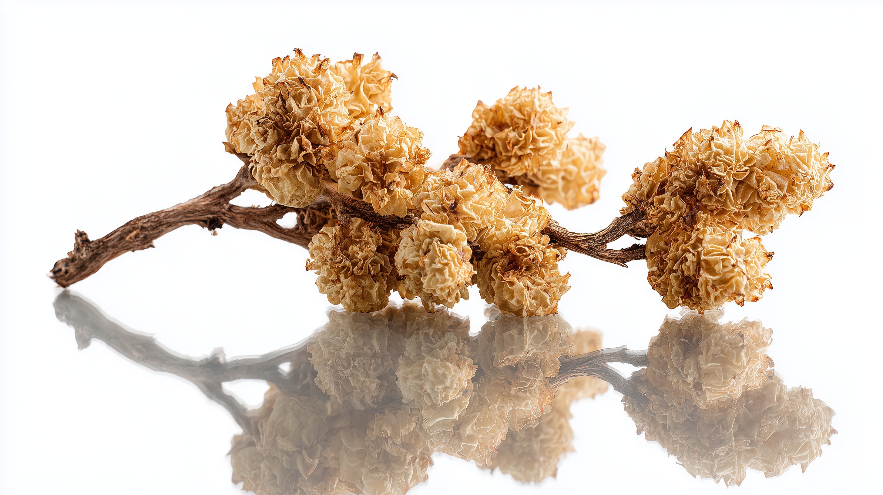 Dieses stimmungsvolle Fotomotiv zeigt ein elegantes Arrangement aus naturbelassenen Blütenknospen, die an einem kunstvoll geschwungenen Holzzweig angeordnet sind. Die warmen, erdigen Gelbtöne der getrockneten Blüten verleihen der Komposition eine organische, harmonische Ausstrahlung. Durch die hochwertige Bildauflösung und das schlichte weiße Hintergrunddesign wird der Fokus ganz auf die dekorativen Naturobjekte gelenkt. Dieses stilvolle Stockfoto bietet sich für den Einsatz in Produktfotografie, Werbematerial, Blog-Beiträgen oder Einladungskarten an und kann als visuelle Inspiration für natürlich anmutende Wohndekoration dienen. Mit seinen ruhigen Formen und natürlichen Materialien vermittelt das Motiv Eleganz und Authentizität.