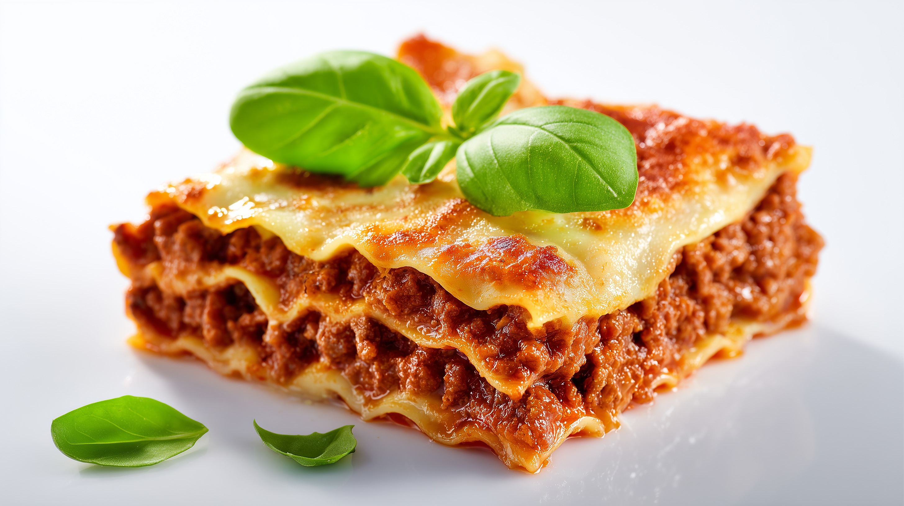 Dieses Foto zeigt ein köstliches Stück klassische italienische Lasagne. Die Pasta-Spezialität ist mit einer leckeren Hackfleischsoße, würzigem Parmesan und frischen Basilikumblättern angerichtet. Die appetitlichen Lasagne-Schichten leuchten in einem warmen Orange-Ton und verleihen dem Gericht eine appetitliche Optik. Perfekt als herzhaftes Mittagessen oder Abendessen für die ganze Familie. Die Nahaufnahme auf der weißen Oberfläche lässt die Lasagne förmlich aus dem Bild springen und weckt Essenslust. Solche stimmungsvollen Food-Fotos sind ideal für Rezeptblogs, Social-Media-Kanäle oder als Eyecatcher in Newslettern und Präsentationen zum Thema mediterrane Küche und klassische italienische Spezialitäten.