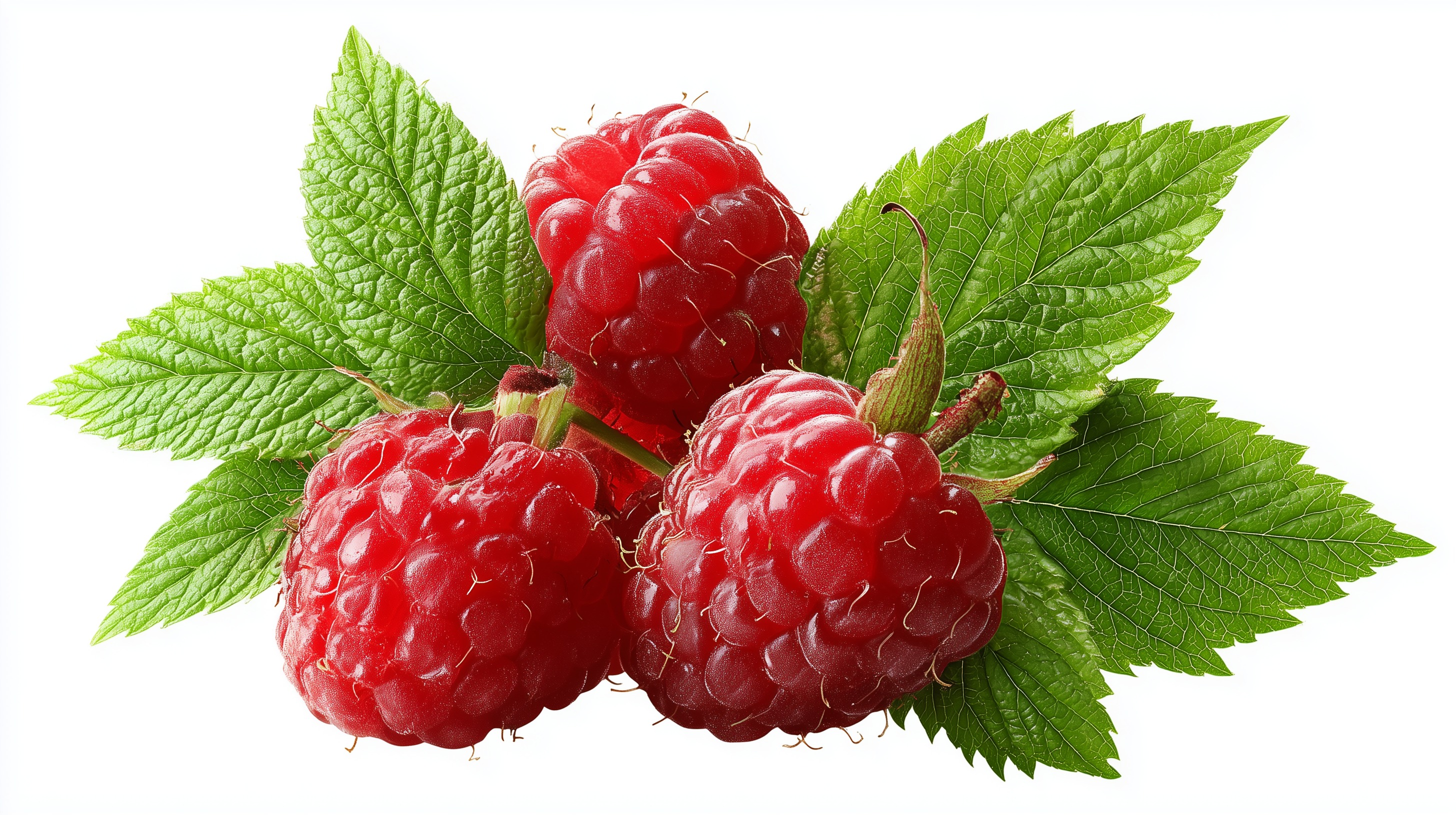 Das Foto zeigt eine Nahaufnahme von frischen roten Himbeeren, umgeben von grünen, saftigen Blättern. Die Früchte stehen im Vordergrund und bilden den Mittelpunkt der Komposition, während die Blätter einen dekorativen Rahmen um sie herum bilden. Die Perspektive ist leicht von oben, was den Blick auf die samtigen, glänzenden Beeren lenkt. Die Farben sind kräftig und lebendig, was eine appetitliche und frische Atmosphäre erzeugt. Dieses Bild eignet sich hervorragend für den Einsatz in Blogs, sozialen Medien, Präsentationen oder Newslettern zum Thema gesunde Ernährung, Garten, Lebensmittel oder Fotografie. Die detaillierten, hochauflösenden Aufnahmen der Himbeeren machen das Bild zu einem wertvollen Werbe- und Illustrationselement.