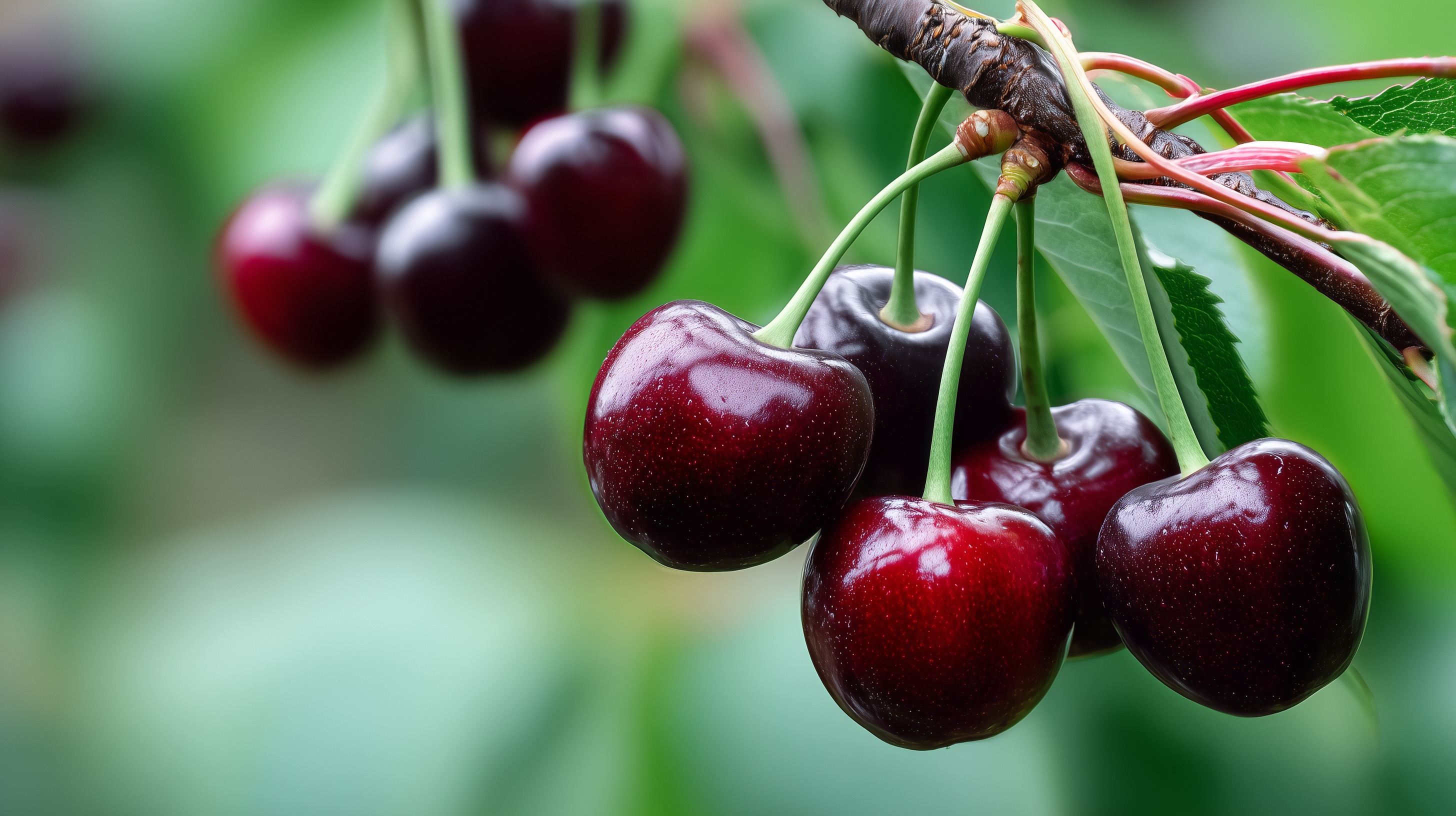 Das Foto zeigt eine Nahaufnahme von reifen, saftig-glänzenden Kirschen, die an einem Kirschbaum hängen. Die Früchte sind in einem kräftigen, tiefroten Farbton und heben sich gegen den grünen Hintergrund der Blätter deutlich ab. Die Perspektive ist nah an die Kirschen herangerückt, sodass der Fokus ganz auf deren Details und Textur liegt. Die Komposition wirkt frisch, natürlich und appetitanregend.