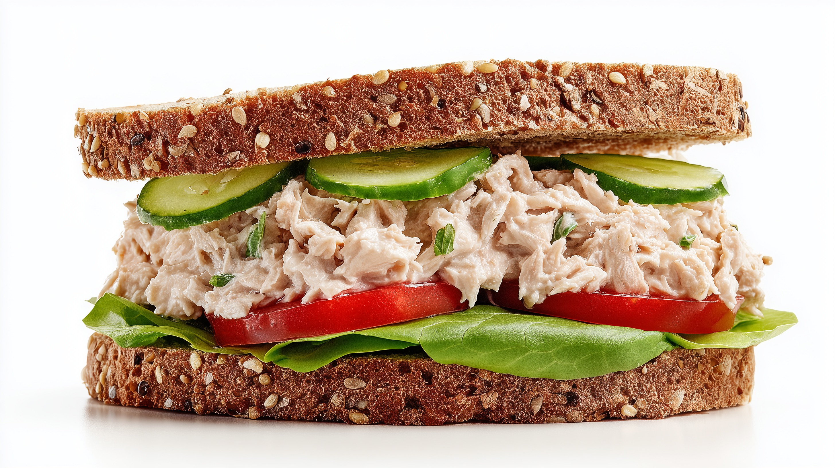 Das Foto zeigt ein leckeres und nahrhaftes Sandwich mit Thunfischsalat. Es besteht aus zwei Scheiben dunklen Vollkornbrots, die mit einer cremigen Thunfischsalat-Mischung belegt sind. Dazwischen befinden sich frische Salatblätter, Gurkenscheiben und rote Tomatenscheiben, die dem Sandwich einen erfrischenden Biss verleihen. Das Sandwich ist auf einem weißen Hintergrund freistehend fotografiert, sodass die Zutaten und die appetitliche Präsentation im Mittelpunkt stehen. Dieses Foto eignet sich hervorragend für Rezeptbeiträge in Blogs oder Zeitschriften, für Präsentationen zum Thema gesunde Ernährung oder als Eyecatcher in sozialen Medien, um Appetit auf ein leckeres und sättigendes Mittagessen zu machen.