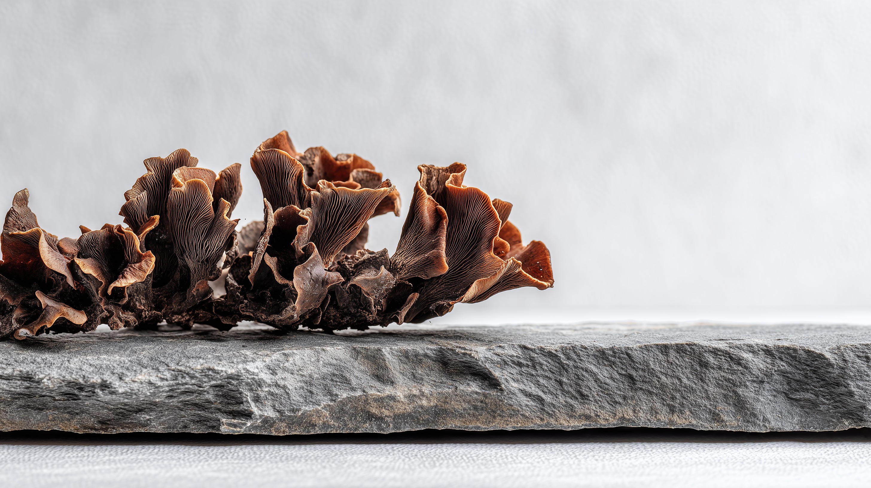 Dieses faszinierende Foto zeigt eine abstrakte Pilzstruktur auf einem Stein. Die natürlichen Formen und Linien erschaffen eine künstlerisch anmutende Komposition, bei der der Kontrast zwischen dem dunklen Braun der Pilze und dem grauen Stein besonders hervorsticht.