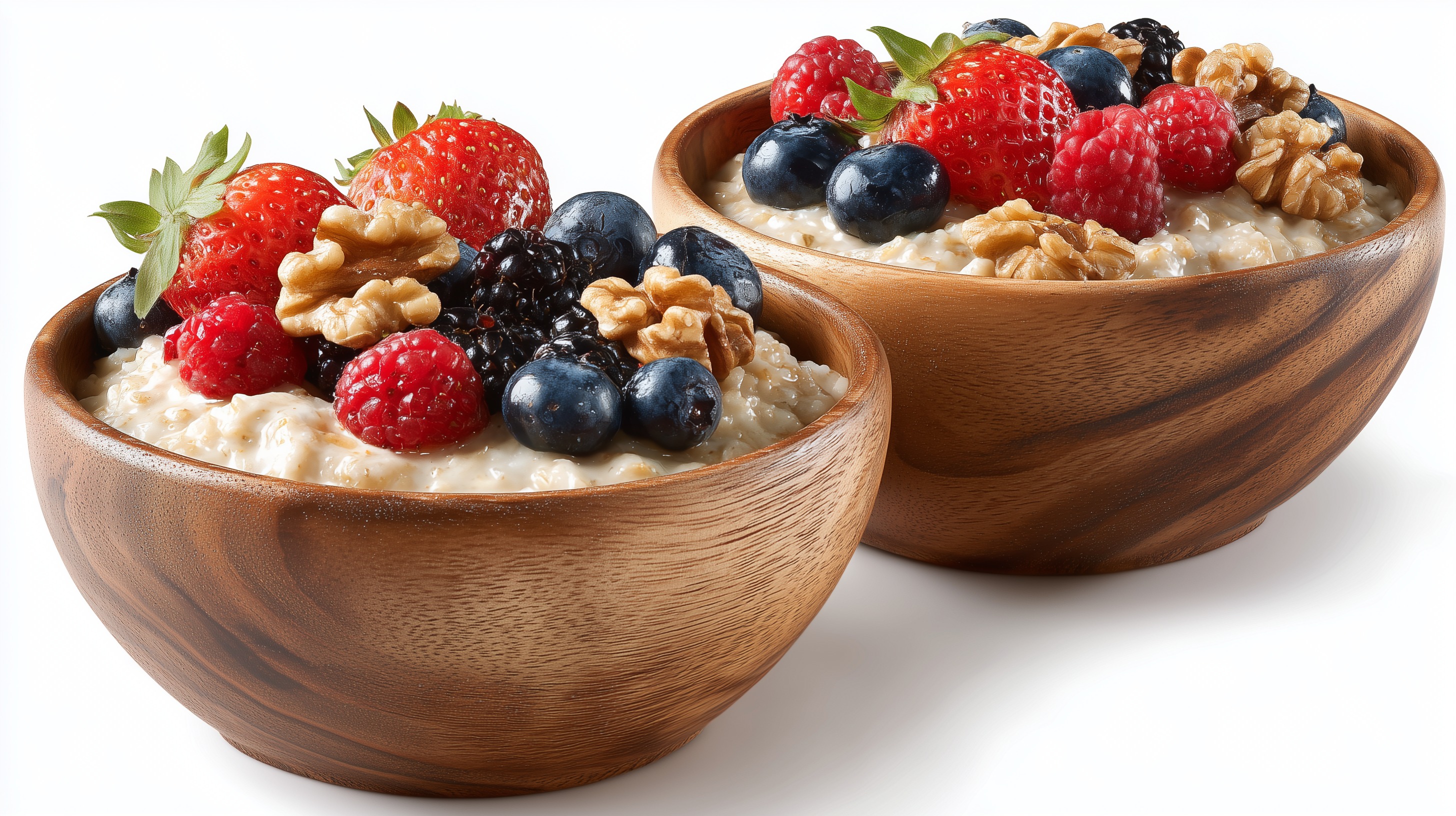 Das Bild zeigt zwei Holzschalen gefüllt mit köstlichem Müsli. Die Schalen sind mit frischen Beeren wie Erdbeeren, Himbeeren und Heidelbeeren sowie knusprigen Walnüssen garniert. Das Ganze wirkt sehr frisch, natürlich und appetitlich. Die Nahaufnahme ermöglicht einen detaillierten Blick auf die Textur und Farben der Zutaten. Das Müsli erscheint nahrhaft und ausgewogen, mit der perfekten Balance zwischen fruchtigen, nussigen und cremigen Elementen. Das Foto wäre ideal für Rezept-Beiträge, Ernährungsratgeber oder zur Präsentation gesunder Frühstücks- und Snack-Ideen in Blogs, sozialen Medien oder Werbekampagnen. Mit den natürlichen Farben, der sauberen Optik und dem appetitlichen Gesamteindruck strahlt das Bild Frische, Vitalität und Wohlbefinden aus.