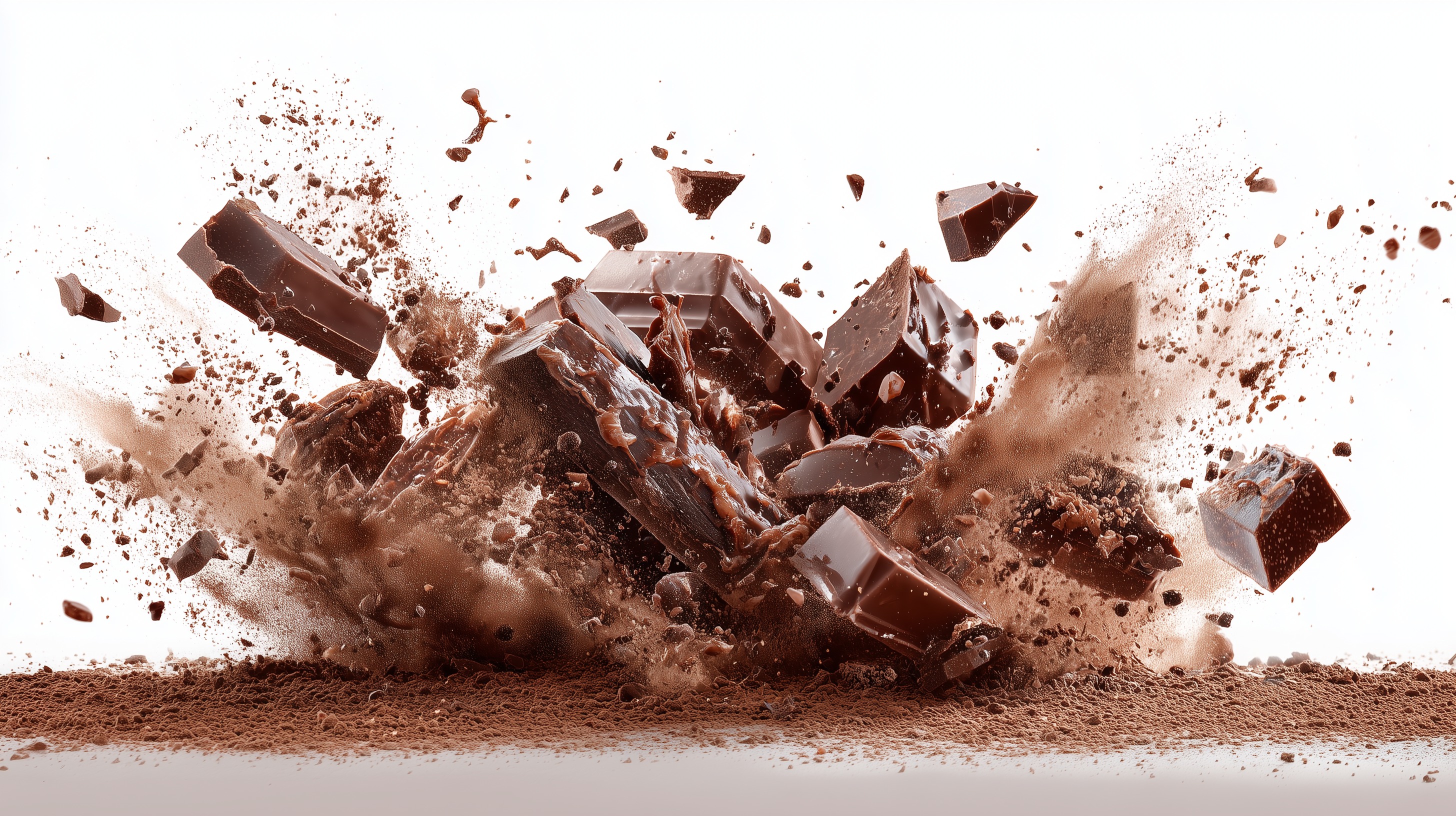 Dieses faszinierende Foto zeigt einen explosionsartig zersplitterten Schokoladenblock in Nahaufnahme. Die Schokoladenstücke fliegen in dynamischer Bewegung auseinander und formen eine abstrakte, lebendige Textur. Die warmen, braunen Farbtöne verleihen dem Motiv eine natürliche, sinnliche Ausstrahlung.